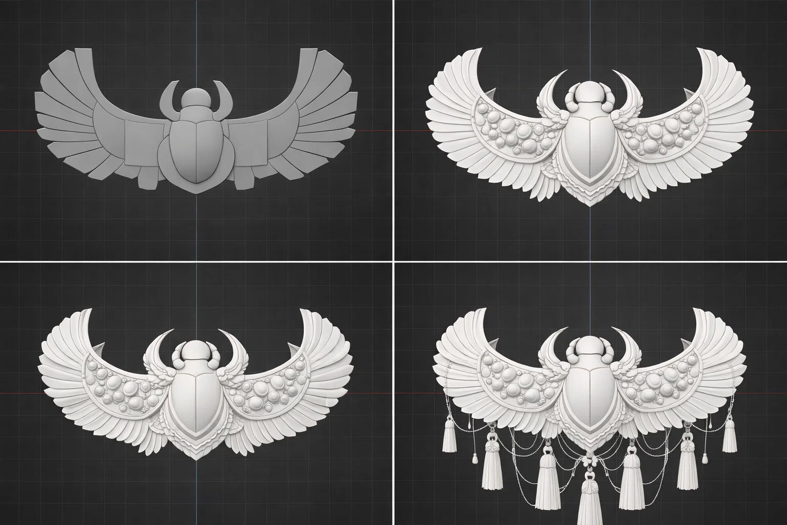 Sự độc đáo của mẫu này nằm ở khả năng tùy biến và cấu trúc phân tầng. Bạn có thể in riêng lẻ phần thân bọ hung và các chi tiết tua rua, dây trang trí để tạo độ rủ tự nhiên giống như một chiếc mũ đội đầu thật sự. Đây không chỉ là một phụ kiện trưng bày mà còn là tác phẩm nghệ thuật có thể ứng dụng trong các buổi chụp ảnh nghệ thuật hoặc sự kiện thời trang avant-garde. Với thiết kế dạng khối cánh vươn rộng, sản phẩm mang lại cảm giác sang trọng, mạnh mẽ và đầy tính huyền bí cho người sử dụng.