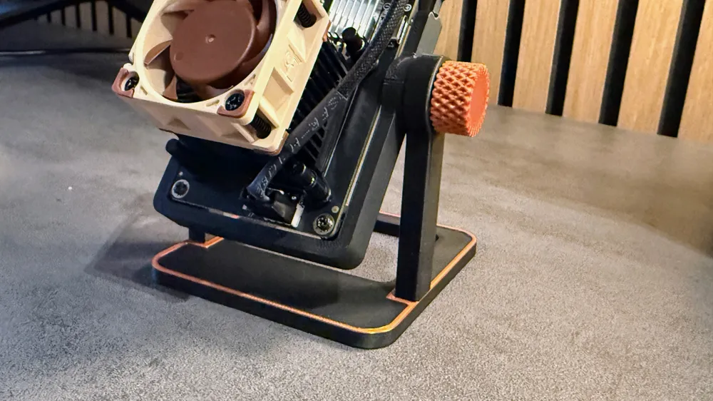 Điểm đặc biệt của chân đế này chính là khả năng điều chỉnh góc nghiêng linh hoạt. Nhờ thiết kế cơ khớp nối với núm vặn bên hông, bạn có thể dễ dàng thay đổi góc nhìn của màn hình hiển thị hoặc hướng luồng gió của quạt tản nhiệt sao cho tối ưu nhất. Điều này cực kỳ quan trọng đối với các thiết bị đào Bitcoin mini thường xuyên tỏa nhiệt, giúp bạn vừa quan sát các thông số kỹ thuật trên màn hình OLED dễ dàng, vừa đảm bảo luồng không khí lưu thông tốt nhất cho linh kiện bên trong.