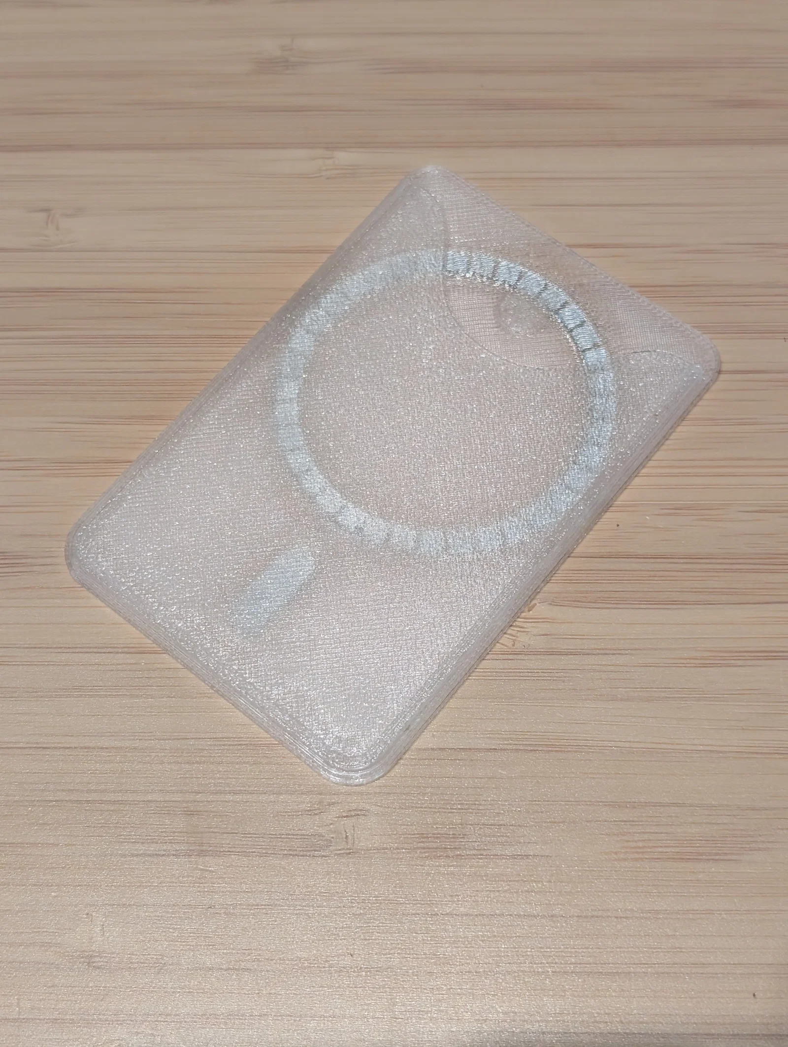 Mình muốn tạo ra cái ví đựng thẻ mỏng nhất có thể, chỉ dành cho đúng một chiếc thẻ thôi. Mô hình này in làm 2 phần, mọi người nhớ thêm lệnh tạm dừng (pause) khi in để chèn nam châm vào nhé. Mình dùng loại nam châm này: amazon.com/dp/B09FZ5Z7S4. Hãy đảm bảo kiểm tra hướng in trước khi bắt đầu. Chỉ có duy nhất 1 lớp nhựa nằm dưới nam châm (để đạt độ chắc chắn tối đa), nên hãy canh chỉnh lớp in đầu tiên (first layer) thật kỹ nhé. Mình đã in bằng nhựa PETG trong suốt.