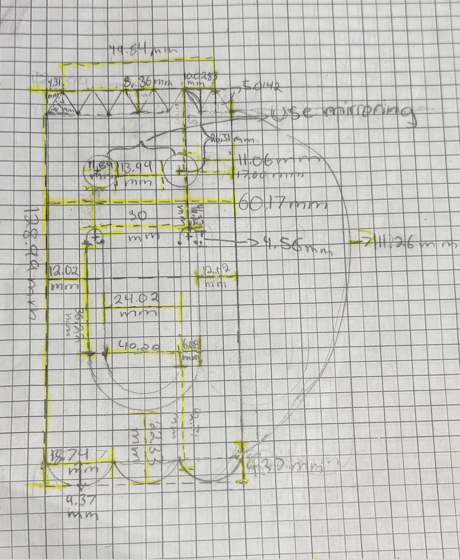 - Để bắt đầu, mình đo kích thước Ghost Clip bằng thước kẹp điện tử. Mình tạo khung ràng buộc trên giấy kẻ ô, tìm mọi số đo có thể rồi mới bắt đầu dựng trong SolidWorks. Tuy nhiên, mình cũng gặp vài thử thách.