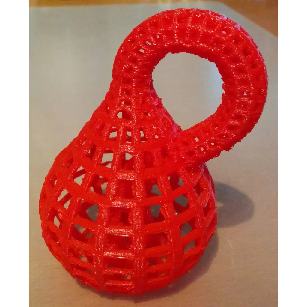 Đây là mẫu Klein bottle được thiết kế theo phong cách wireframe để bạn có thể nhìn xuyên suốt toàn bộ bề mặt bên trong. Nếu dùng bề mặt đặc (solid), chiếc bình này trông sẽ không mấy thú vị và rất khó hình dung được ý nghĩa hình học của nó, vì vậy mình đã tạo ra phiên bản này. Mô hình này in không cần support, tuy nhiên cũng không hẳn là dễ in vì nó đòi hỏi máy phải được cân chỉnh chuẩn xác và độ bám dính trên bàn in phải thật tốt. Cập nhật: Mình đã thử in với layer 0.3mm và kết quả rất thành công (hình màu vàng).