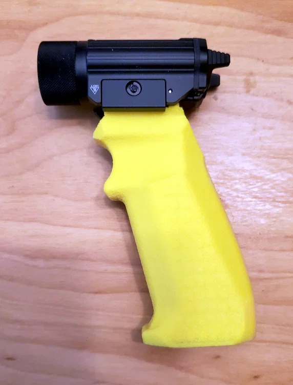 Mình có một cây đèn Streamlight TLR-1 hàng nhái mua từ Harbor Freight và quyết định gắn nó vào một cái tay cầm để dùng như đèn pin cầm tay. Bạn có thể dễ dàng điều khiển công tắc đèn bằng ngón cái, và nếu thích thì gắn thêm dây đeo cho chắc chắn.