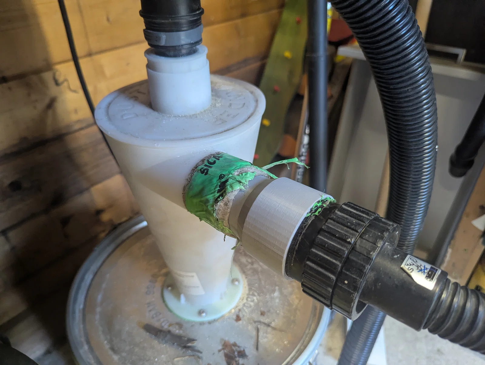 Sau một thời gian dài phải dùng băng keo và đai siết để nối ống hút bụi Makita cũ của mình vào cái Dust Commander xịn sò, cuối cùng thì mình cũng quyết định in một cái adapter chắc chắn hơn. Bạn có thể chiêm ngưỡng tàn tích của "công nghệ cũ" ở bức ảnh thứ hai. Adapter này được thiết kế hơi côn một chút để khớp nối thật khít và êm. Nó không bị gờ bên trong nên rác sẽ không bị mắc lại như mấy loại adapter khác đâu - cẩn thận nhé, cái adapter tinh tế này sẽ làm mấy tay thợ khác phải ghen tị đấy.