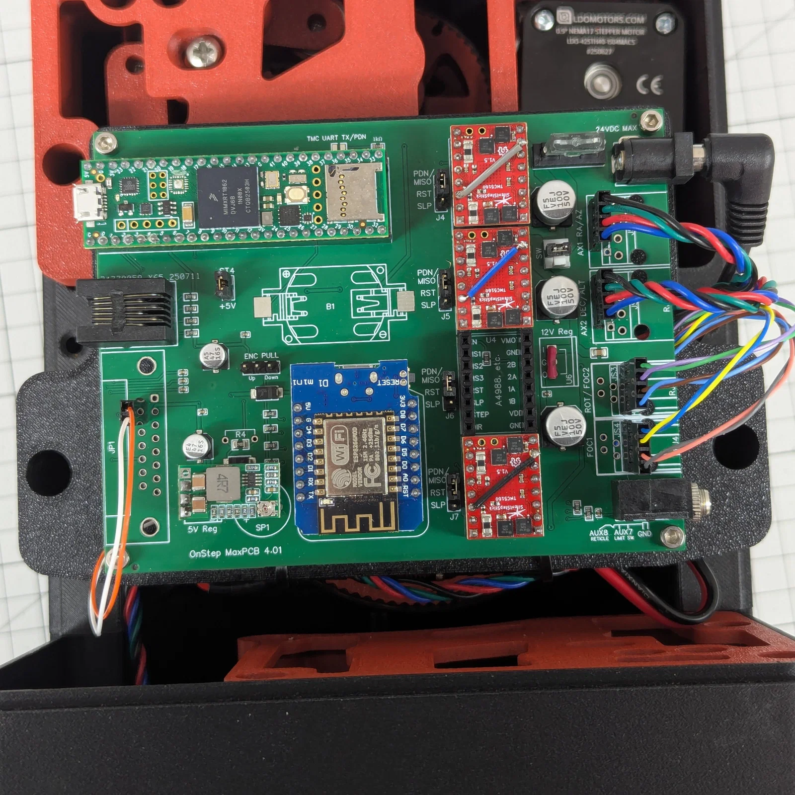 Firmware OnStep điều khiển ngàm và cung cấp liên kết dữ liệu tới hàng loạt phần mềm thiên văn thông qua một trong bốn astrograph đã gắn.