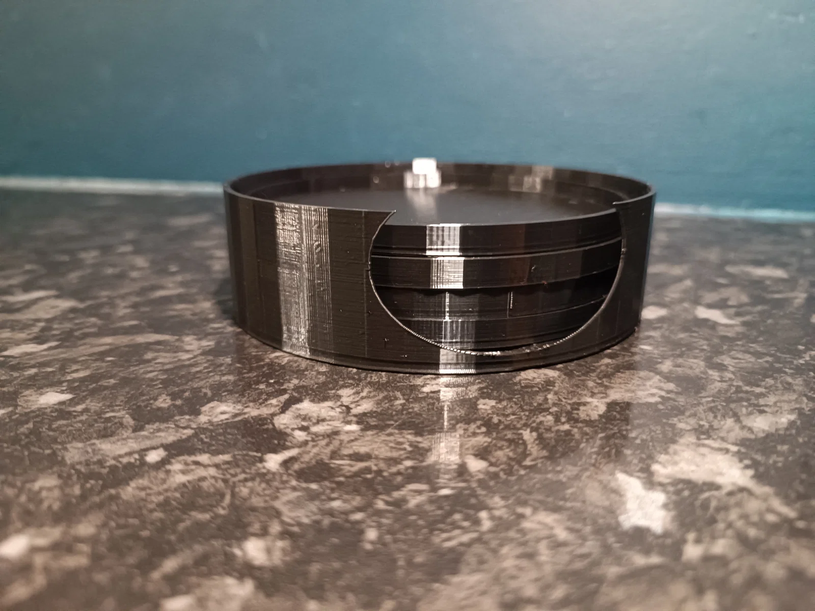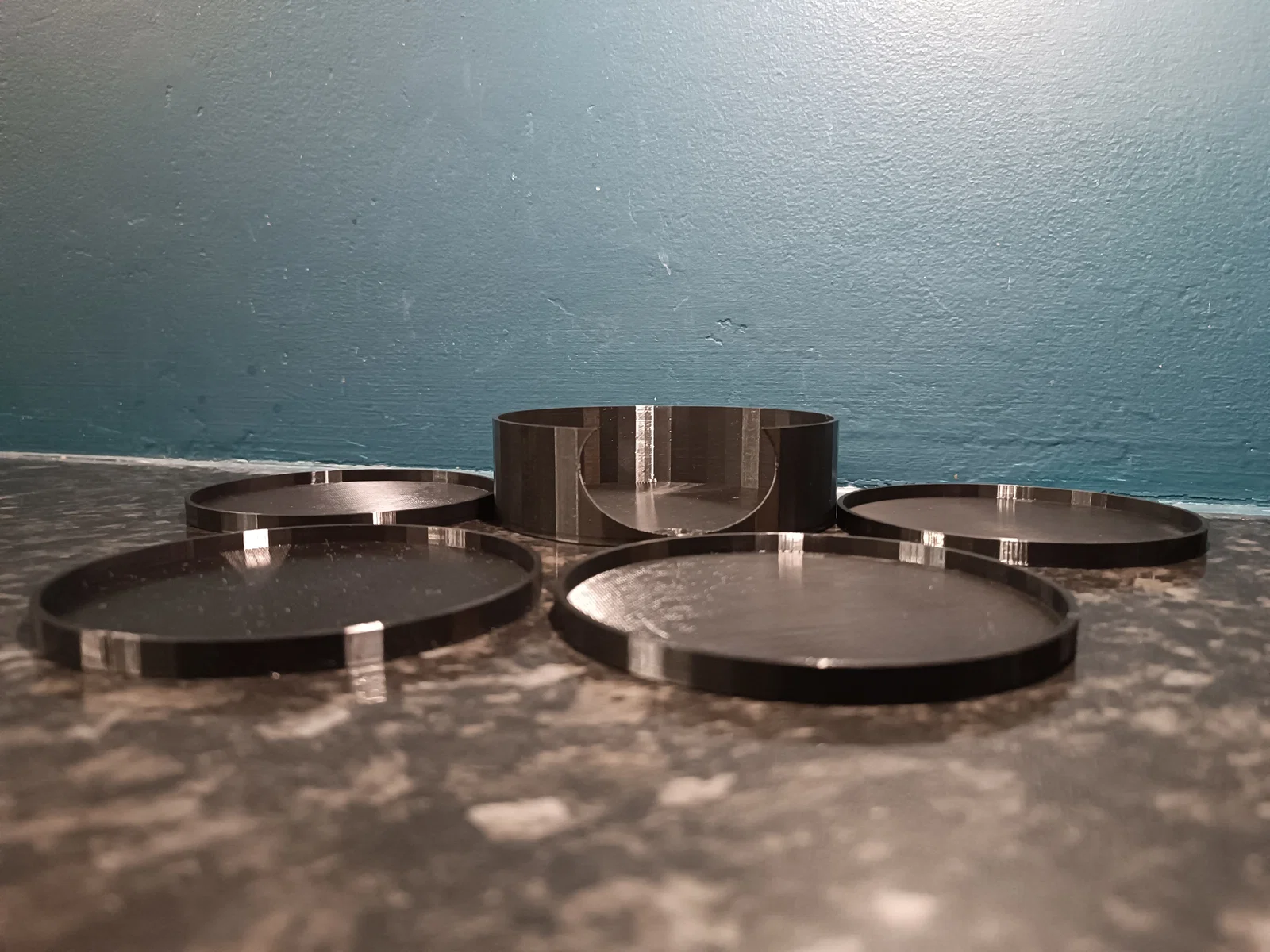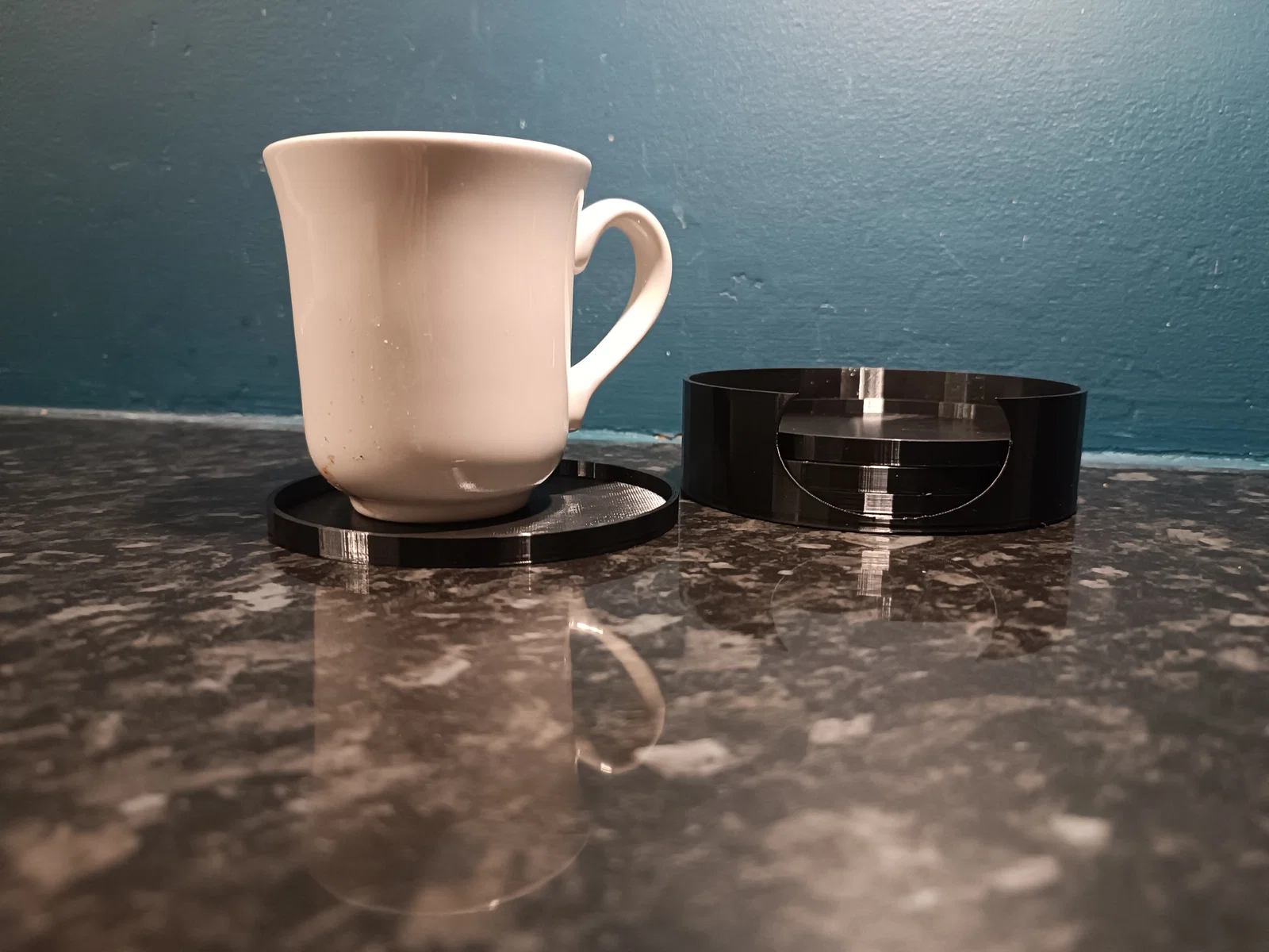Bộ lót ly thiết kế tối giản với vành nhô cao chống tràn nước cùng cốc đựng tiện dụng. Đây là sản phẩm đầu tay của mình, dễ in và phù hợp cho bàn làm việc, phòng khách hay không gian bếp của mọi nhà.