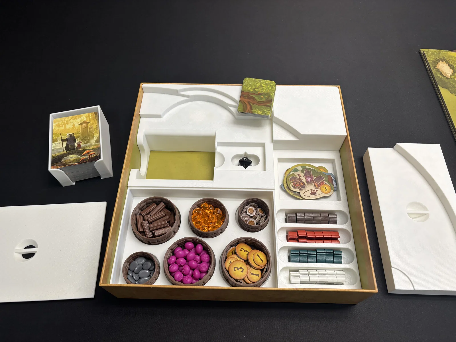 Mình muốn làm một bộ insert để đựng game Everdell bản gốc (3rd edition) mà mình đang sở hữu. Vì mình không dùng bọc bài (sleeves) nên mình không tính đến khoảng trống cho chúng. Khay đựng bài hơi khít một chút, nhưng ngón tay mình to mà vẫn lấy bài ra được. Bộ insert này nằm rất sát trong hộp, đảm bảo các thành phần bên trong không bị xê dịch hay lộn xộn. Đặc biệt là bạn hoàn toàn có thể dựng đứng hộp game để bảo quản.