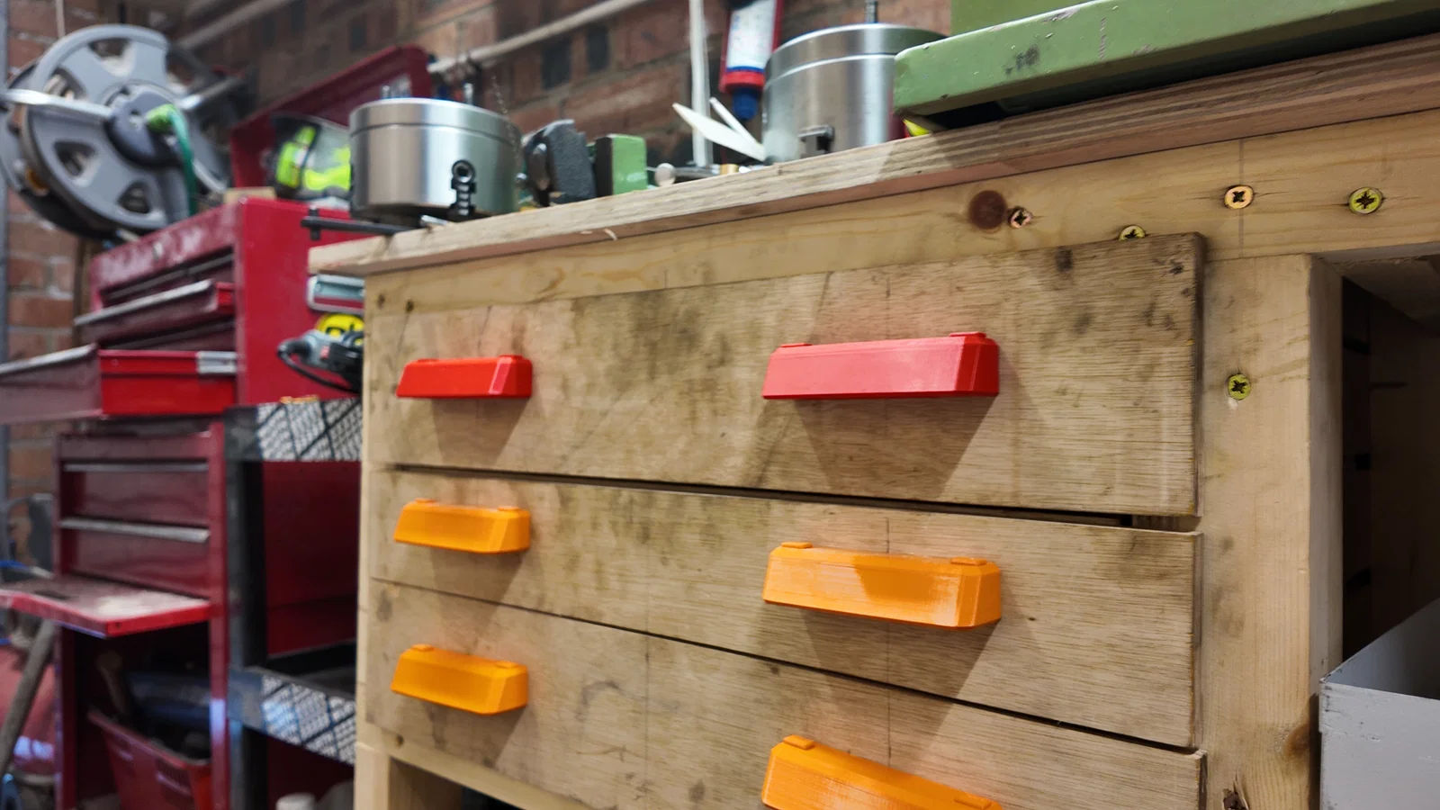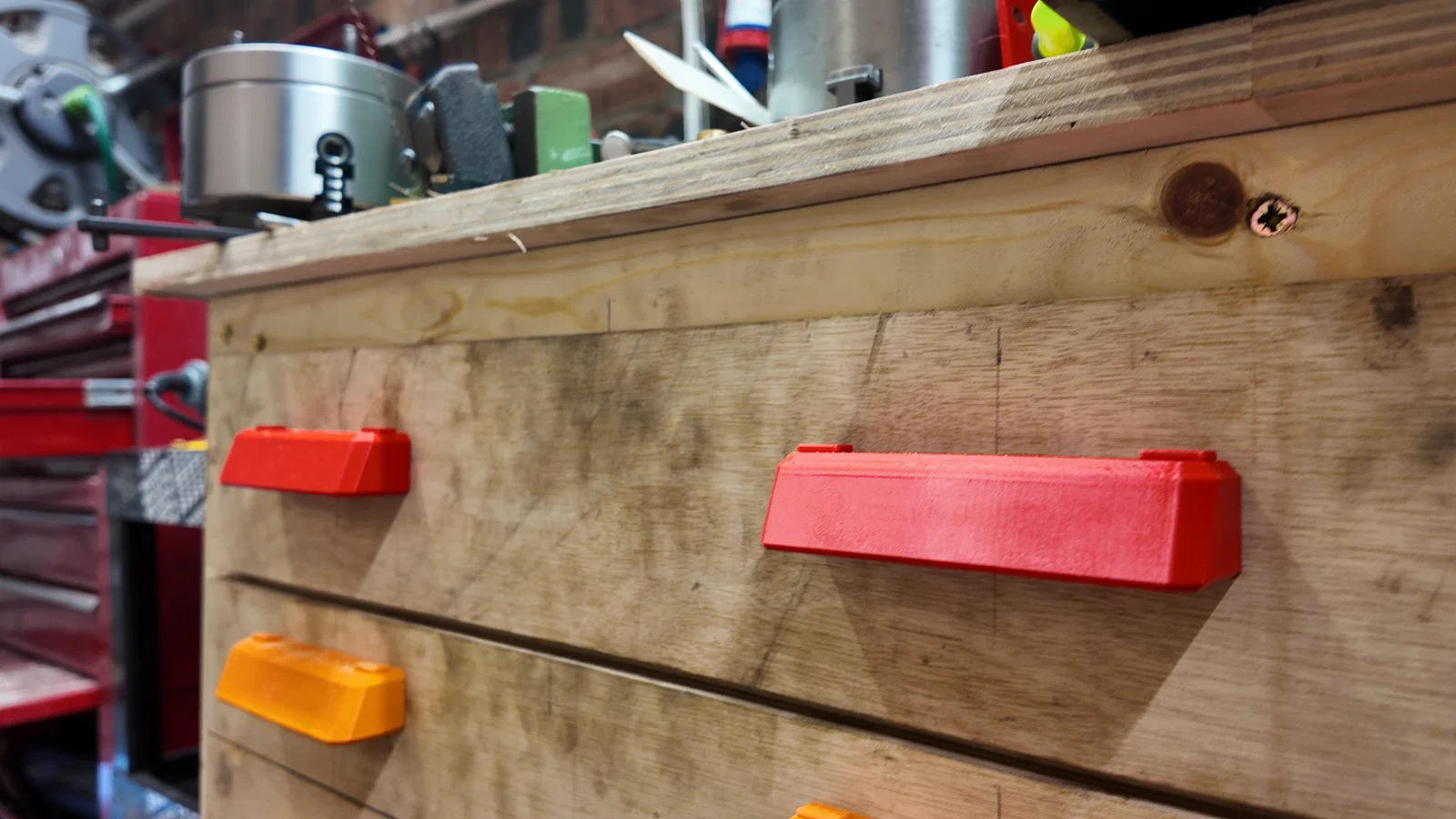Tay nắm ngăn kéo chắc chắn, được in cho vài cái ngăn kéo gỗ dưới gầm bàn.