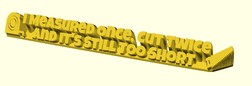Bạn là một thợ mộc hay người yêu thích DIY? Hãy làm mới không gian làm việc của mình với mô hình 3D độc đáo có dòng chữ hài hước: "I Measured Once, Cut Twice And It's Still Too Short". Đây là món quà tuyệt vời giúp xua tan sự căng thẳng khi đo đạc, cắt ghép vật liệu trong quá trình làm nghề. Sản phẩm có thiết kế chữ nổi ấn tượng, dễ dàng in bằng chất liệu PLA trên mọi máy in 3D gia đình mà không cần hỗ trợ. Không chỉ là vật phẩm trang trí bàn làm việc cực chất, mô hình này còn là cách thú vị để bạn thể hiện cá tính riêng và tình yêu với công việc thủ công. Hãy tải về và in ngay để sở hữu một điểm nhấn hài hước cho xưởng mộc của riêng bạn ngay hôm nay.
