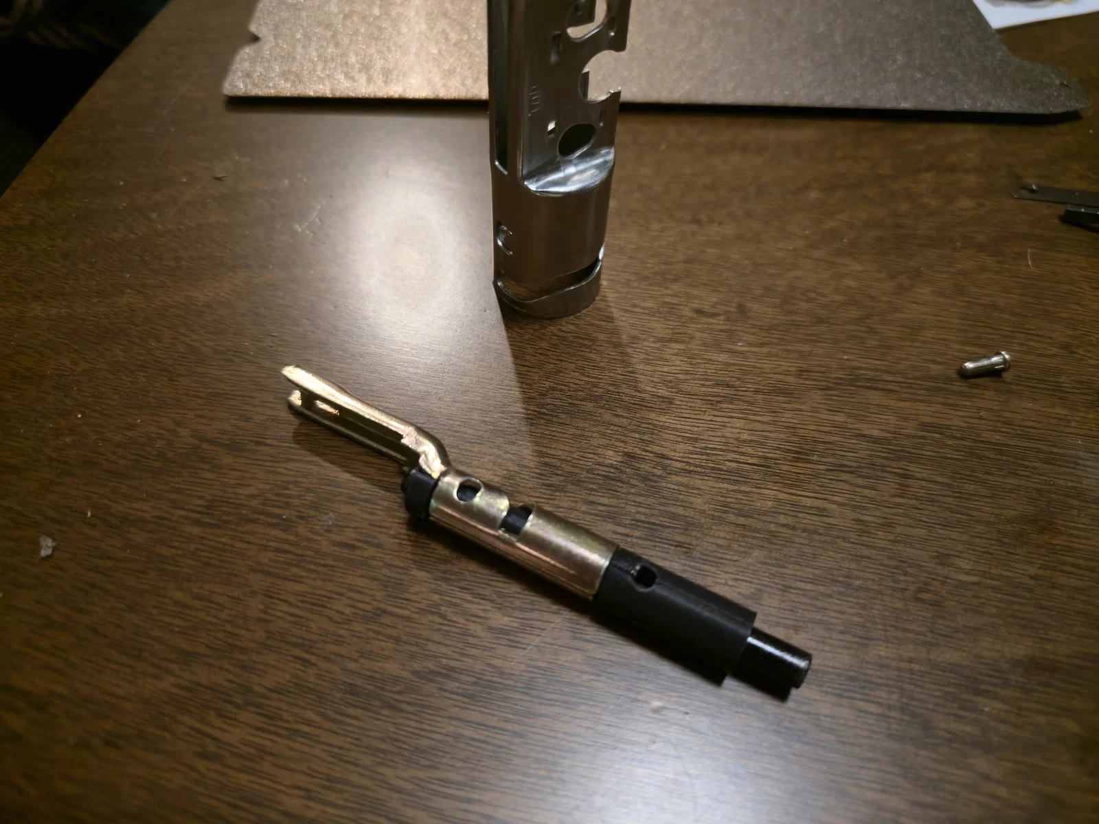 Tiếp theo, lắp bộ nối dài thân chốt vào cơ chế và căn chỉnh mấu của bộ nối vào rãnh. Đặt tay đòn xoay trở lại cơ chế, rồi trượt bộ chốt cùng tay đòn vào vị trí. Đảm bảo nó khớp với tay đòn xoay. Trượt vỏ ngoài của chốt qua bộ nối dài thân và xoay sao cho mấu của vỏ chốt khớp vào rãnh trên bộ nối (vặn để khóa cố định). Lắp lại lò xo cho tay đòn xoay.