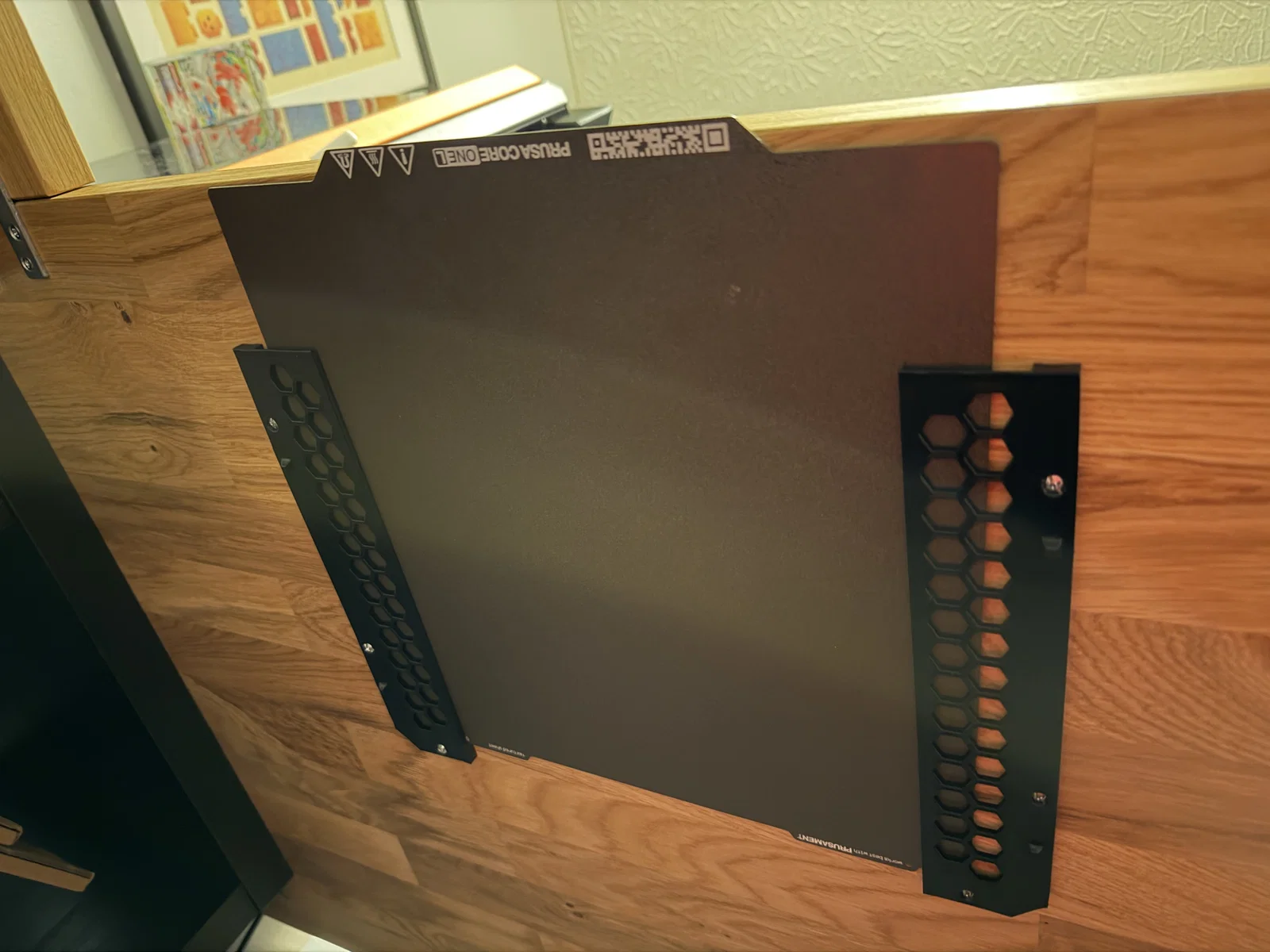 Đây là bộ giá đỡ có thiết kế mỏng gọn giúp bạn sắp xếp các tấm build plate bằng cách treo chúng dưới gầm bàn. Bạn có thể chồng các giá đỡ lên nhau nếu có nhiều hơn một tấm build plate. Mình thấy cách gắn giá đỡ sao cho phần mép trước của tấm build plate hơi nhô ra ngoài cạnh bàn sẽ tiện hơn rất nhiều mỗi khi cần lấy ra thay thế.