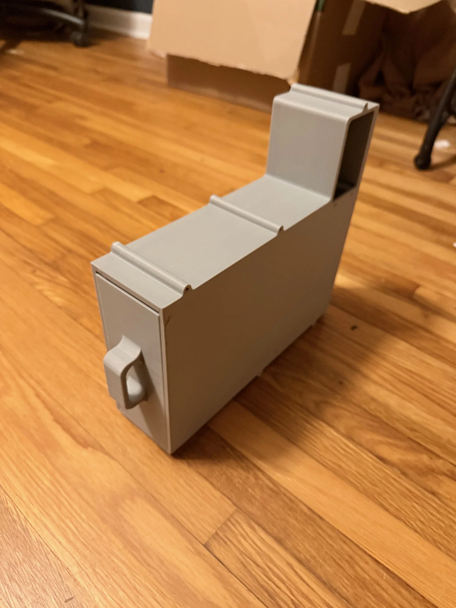 Đây là thùng chứa rác thải (poop bin) mình tự thiết kế dành cho máy in Centauri Carbon, với phần xô đựng rác bên trong có thể trượt ra từ phía bên trái. Mình đã sử dụng tính năng vẽ support (paint supports) cho cái trụ vít ngắn và dùng tree support cho phần mặt dưới của tay cầm. Tất cả các chi tiết đều được xoay hướng sao cho các bức tường thẳng đứng.