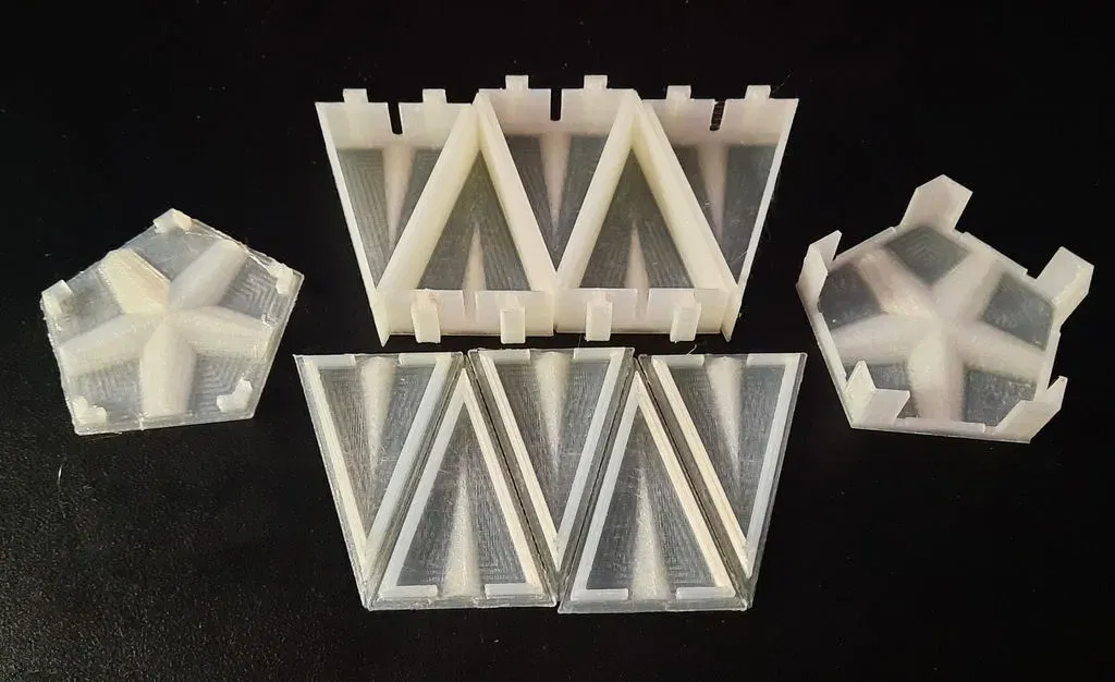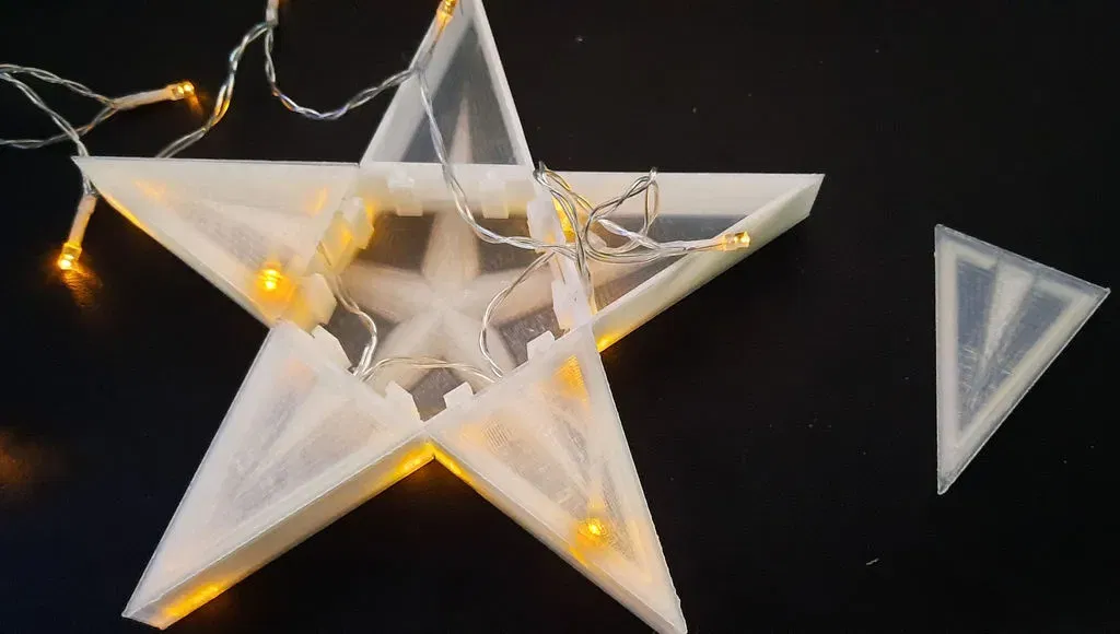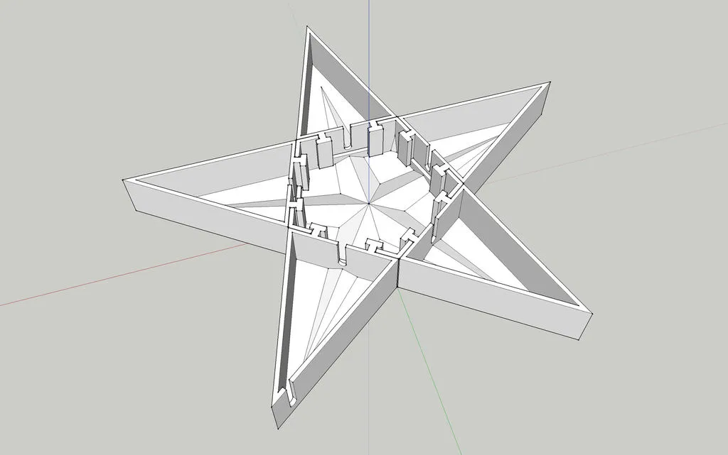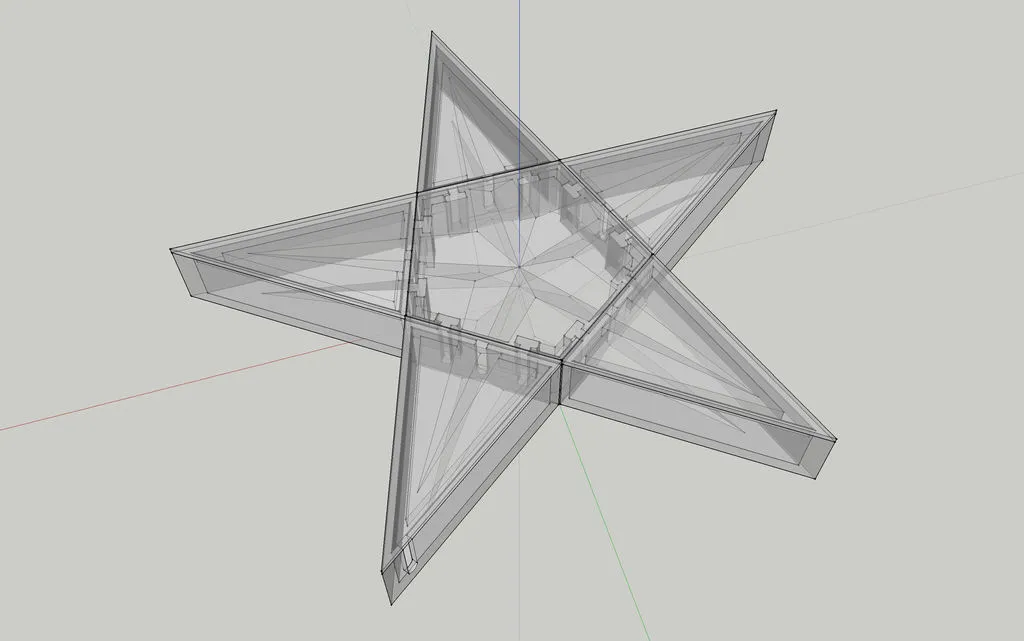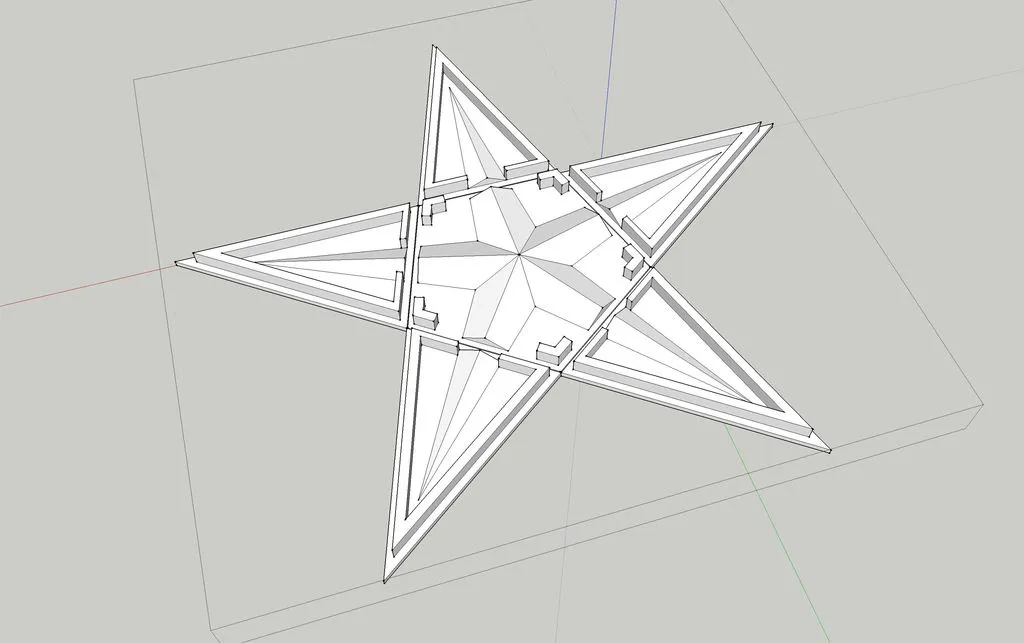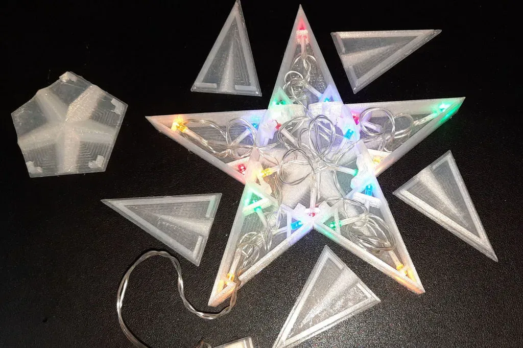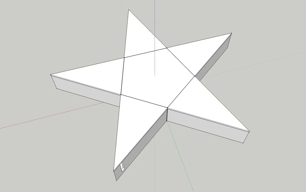 Thiết kế này tạo ra một ngôi sao với bán kính 117.8mm, cho khoảng cách từ đầu này đến đầu kia là 224mm, và độ dày chỉ hơn 25mm. Có hai phiên bản được bao gồm: một phiên bản không có giá đỡ LED và một phiên bản có chúng. Các giá đỡ LED giúp giữ cho các LED có một mẫu hình đều đặn nếu bạn thích điều đó hơn là vẻ ngẫu nhiên. Tôi sẽ đăng một số hình ảnh của phiên bản này trong thời gian tới.