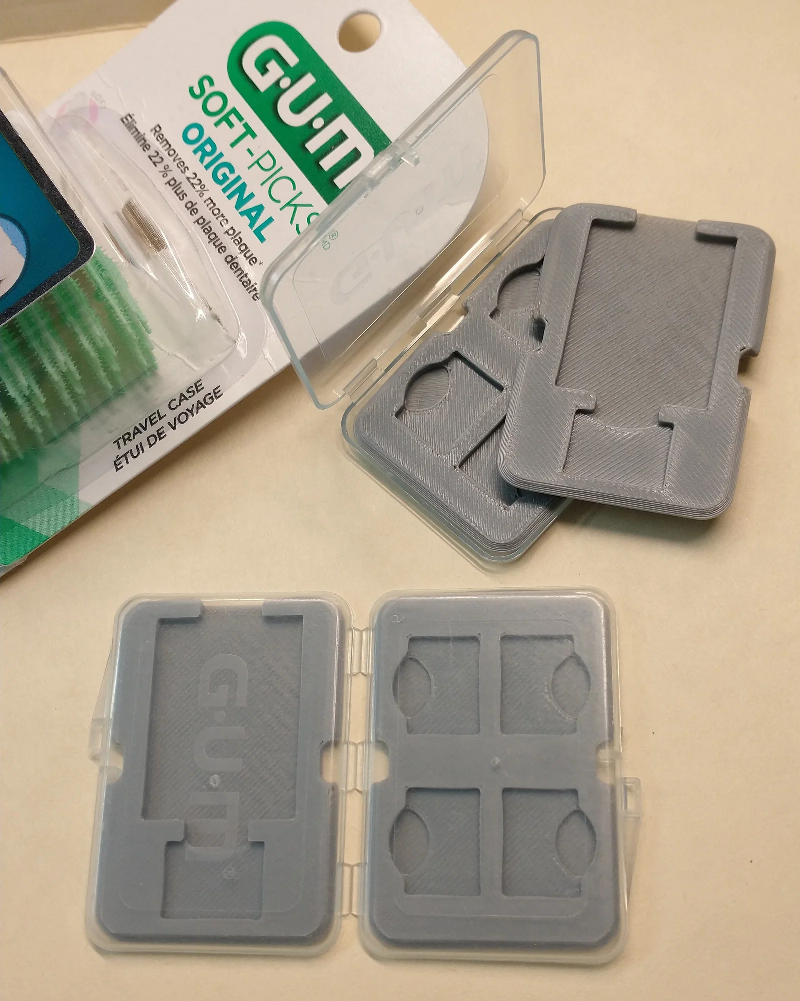 Đây là một dự án khá vui, mặc dù nó không quá thực tế khi trên thị trường đã có quá nhiều lựa chọn để lưu trữ thẻ SD khác. Các miếng đệm (inserts) có thể dùng với thẻ SD quay mặt ra ngoài, hoặc xếp chồng lên nhau với miếng trên quay mặt ra ngoài/miếng dưới quay mặt vào trong như hình. Nếu dùng kiểu quay mặt ra ngoài, bạn có thể dán keo hoặc dùng băng dính hai mặt để cố định chúng lại. Các file bao gồm: TMH_GUM_SD1-R0.stl (cho thẻ SD và microSD) và TMH_GUM_SD2-R0.stl (cho 4 thẻ microSD). Thiết lập in được sử dụng: nhựa PLA, 2 lớp tường (walls), tối thiểu 4 lớp trên và 2 lớp dưới, độ lấp đầy (infill) 20%, tính năng ironing là tùy chọn.