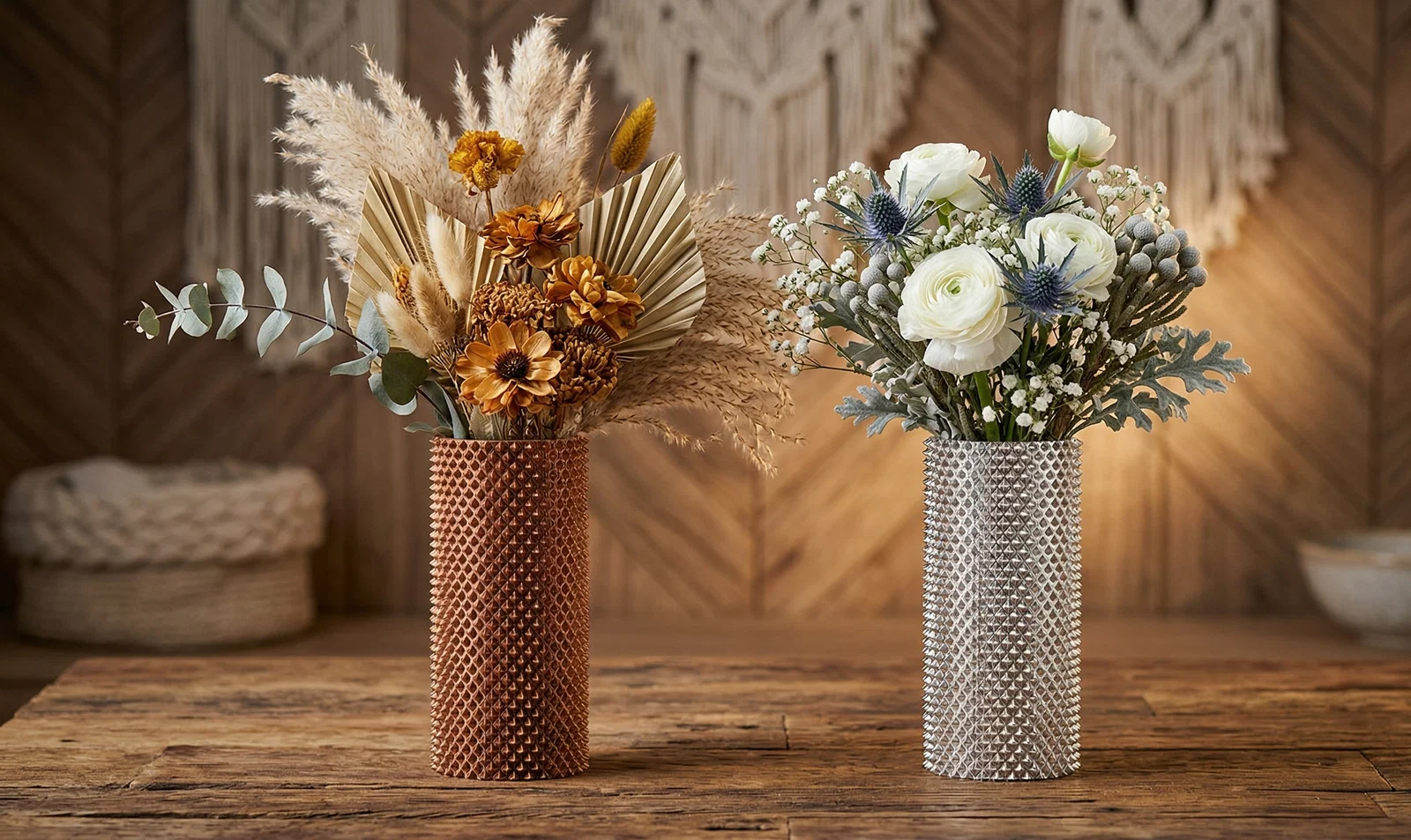 Khám phá sự kết hợp hoàn hảo giữa hình học hiện đại và vẻ đẹp bohemian với bình hoa Geometric Textured Metallic Vase. Thiết kế 3D đinh tán độc đáo, bề mặt ánh kim sang trọng, là điểm nhấn tinh tế cho mọi không gian nội thất từ phong cách cổ điển đến hiện đại.