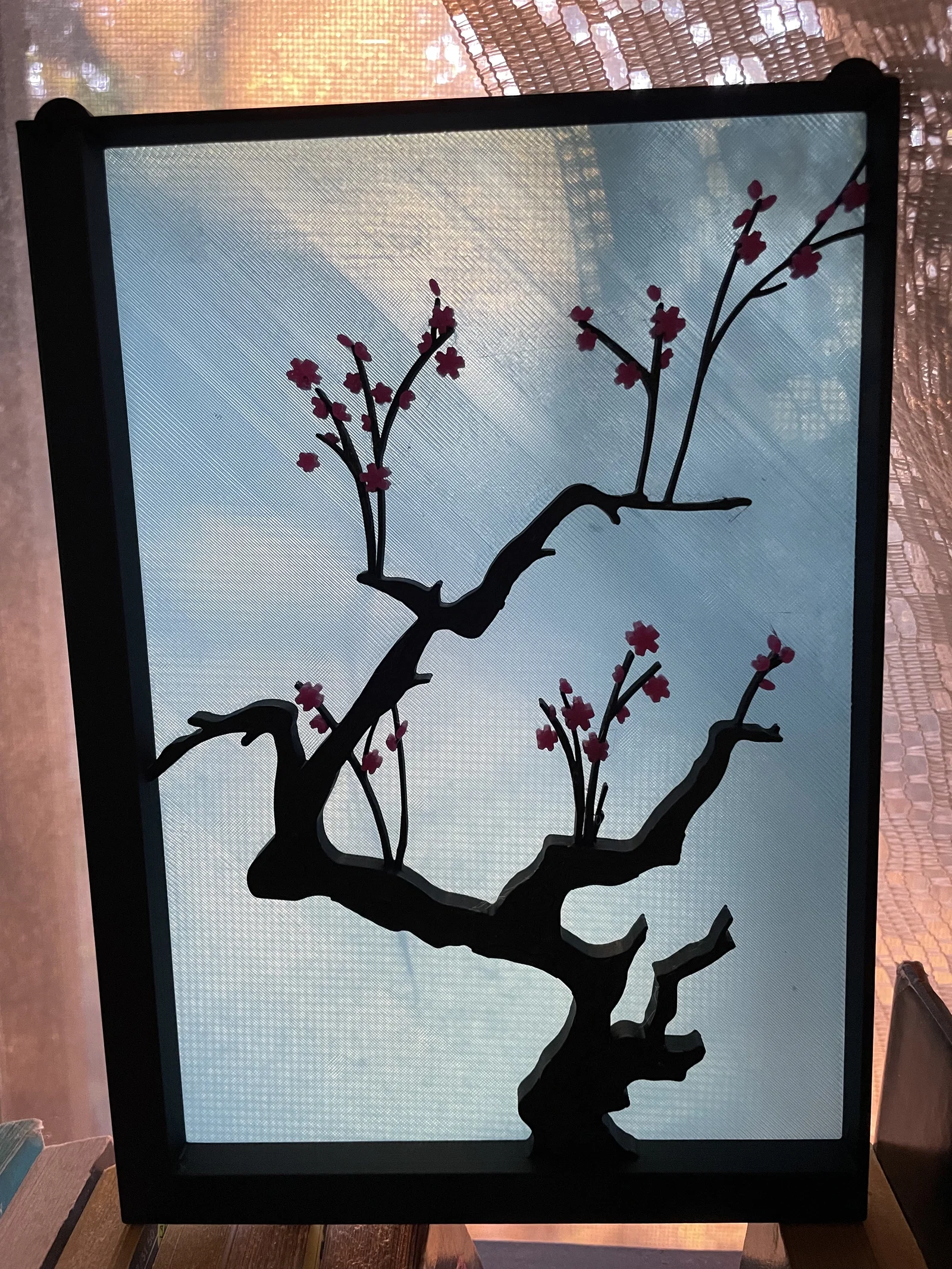 Mô hình nghệ thuật dạng hộp bóng (shadowbox) mô phỏng cây hoa anh đào Nhật Bản đã được tinh chỉnh. Thiết kế tối ưu, không cần hỗ trợ, hỗ trợ tốt cho in đa màu với AMS hoặc máy in đa đầu đùn.