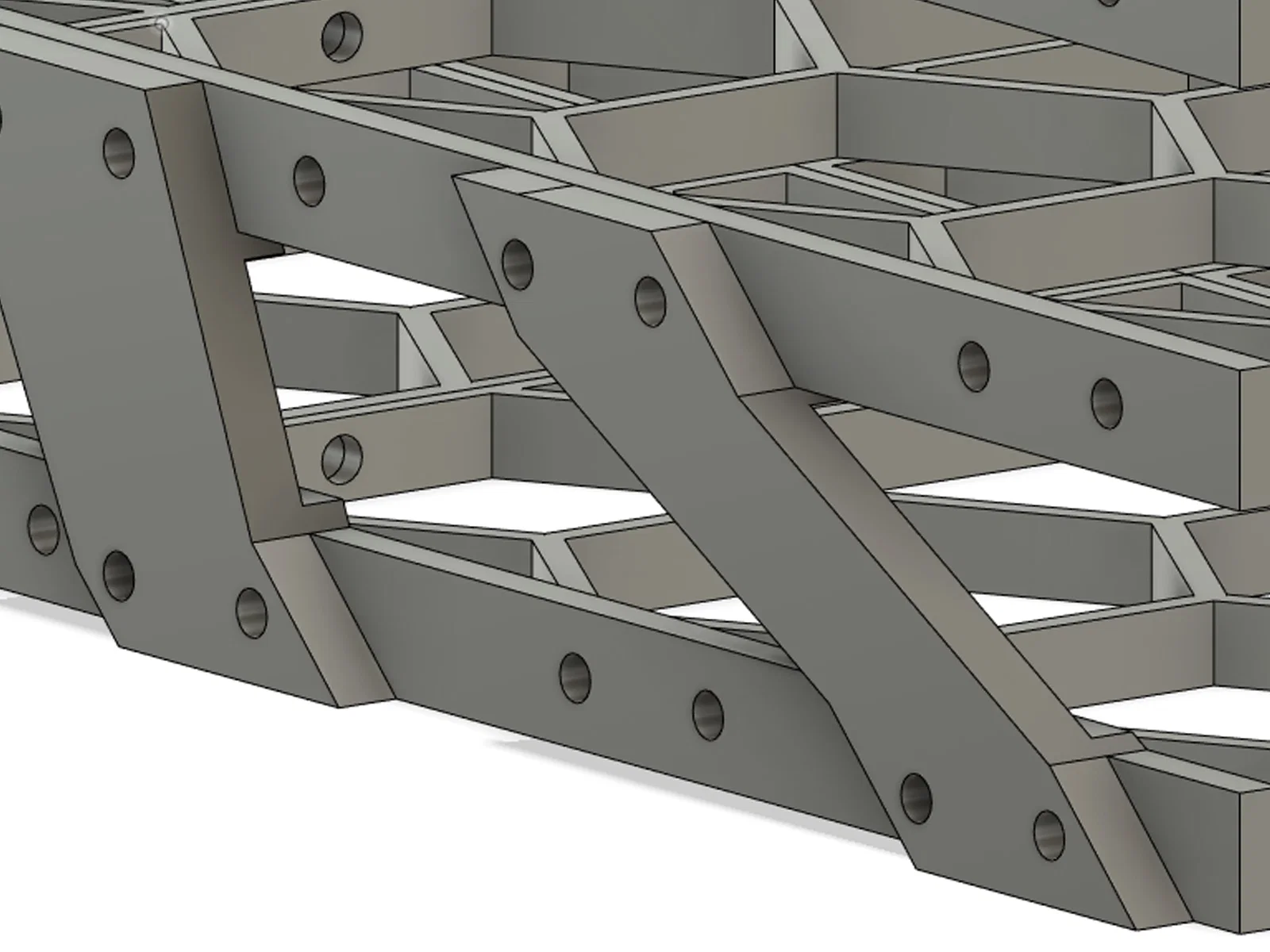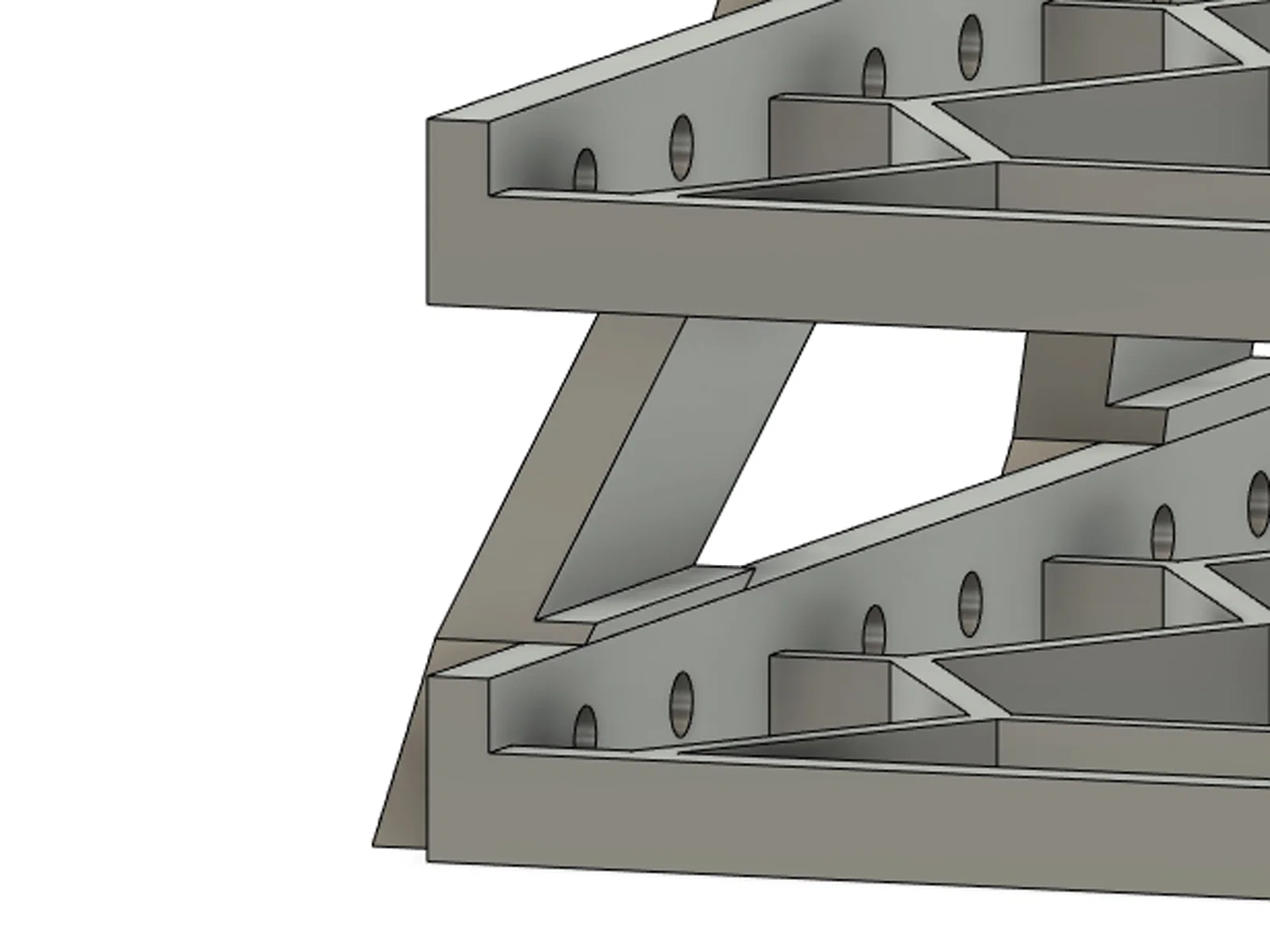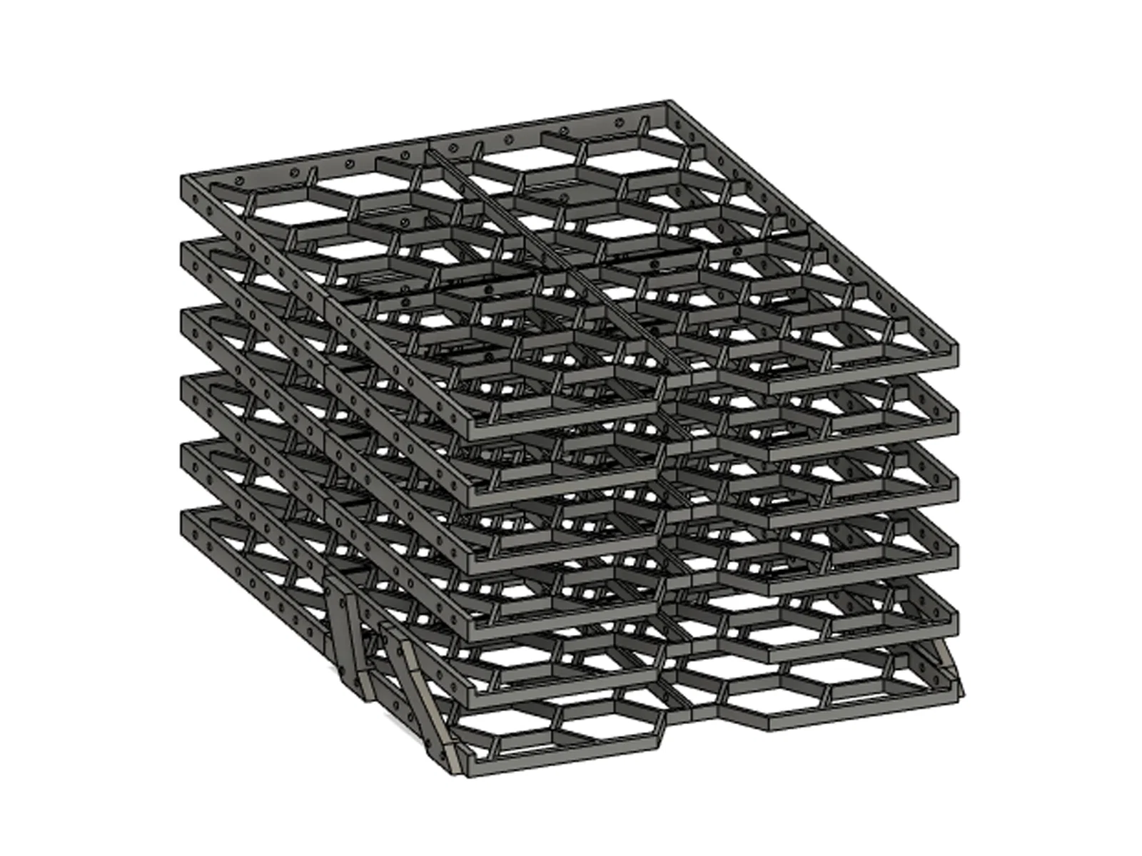 Sau đó, mỗi tầng khay sẽ được gắn vào tầng tiếp theo bằng các thanh đỡ chéo (3 cái cho bên trái và 3 cái cho bên phải). Cách này giúp tạo khoảng cách giữa các tầng, tiết kiệm vật liệu và nhìn tổng thể rất đồng nhất, đúng chuẩn thiết kế module luôn :-)