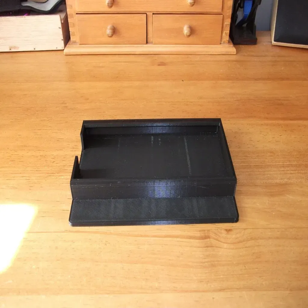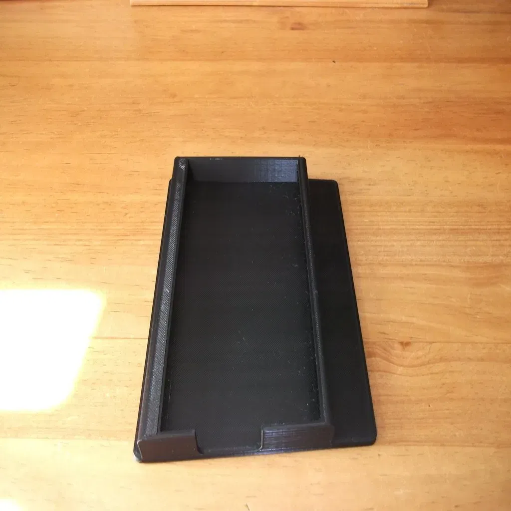 Vì vậy, tôi cần một cái gì đó mà tôi có thể đặt vào ngăn trung tâm, với một bệ cho điện thoại. Tôi đã lên kế hoạch để nó hoạt động giống như các cánh cửa trượt trên những tủ phòng tắm cũ: trượt điện thoại vào kênh trên cùng, và sau đó thả phần dưới vào kênh dưới. Thiết kế đầu tiên của tôi thực hiện điều này hoàn hảo, nhưng sau đó tôi nhận ra rằng tôi sắp nâng cấp điện thoại, và những chiếc điện thoại mới lớn hơn! Vì vậy, tôi đã di chuyển kênh trên lên cao để cho phép một chiếc điện thoại lớn hơn trong tương lai. Dĩ nhiên, tôi không biết liệu điều này có đủ hay không cho đến khi tôi nâng cấp. :D