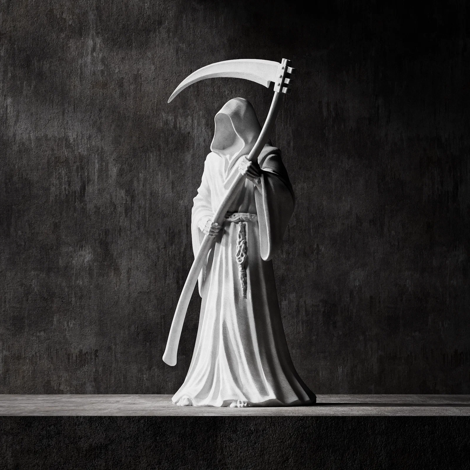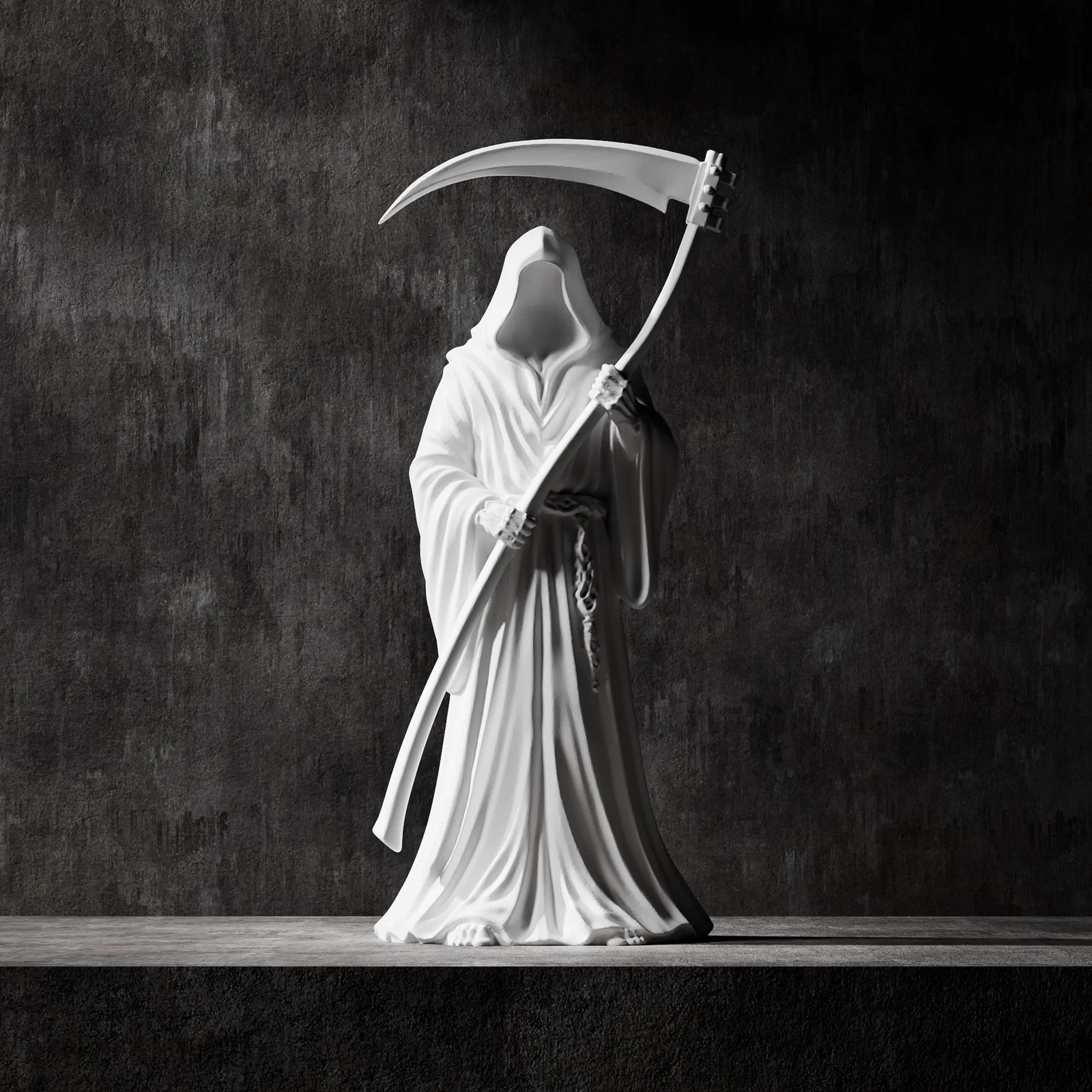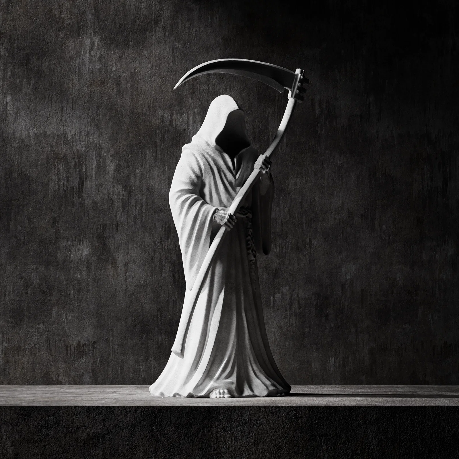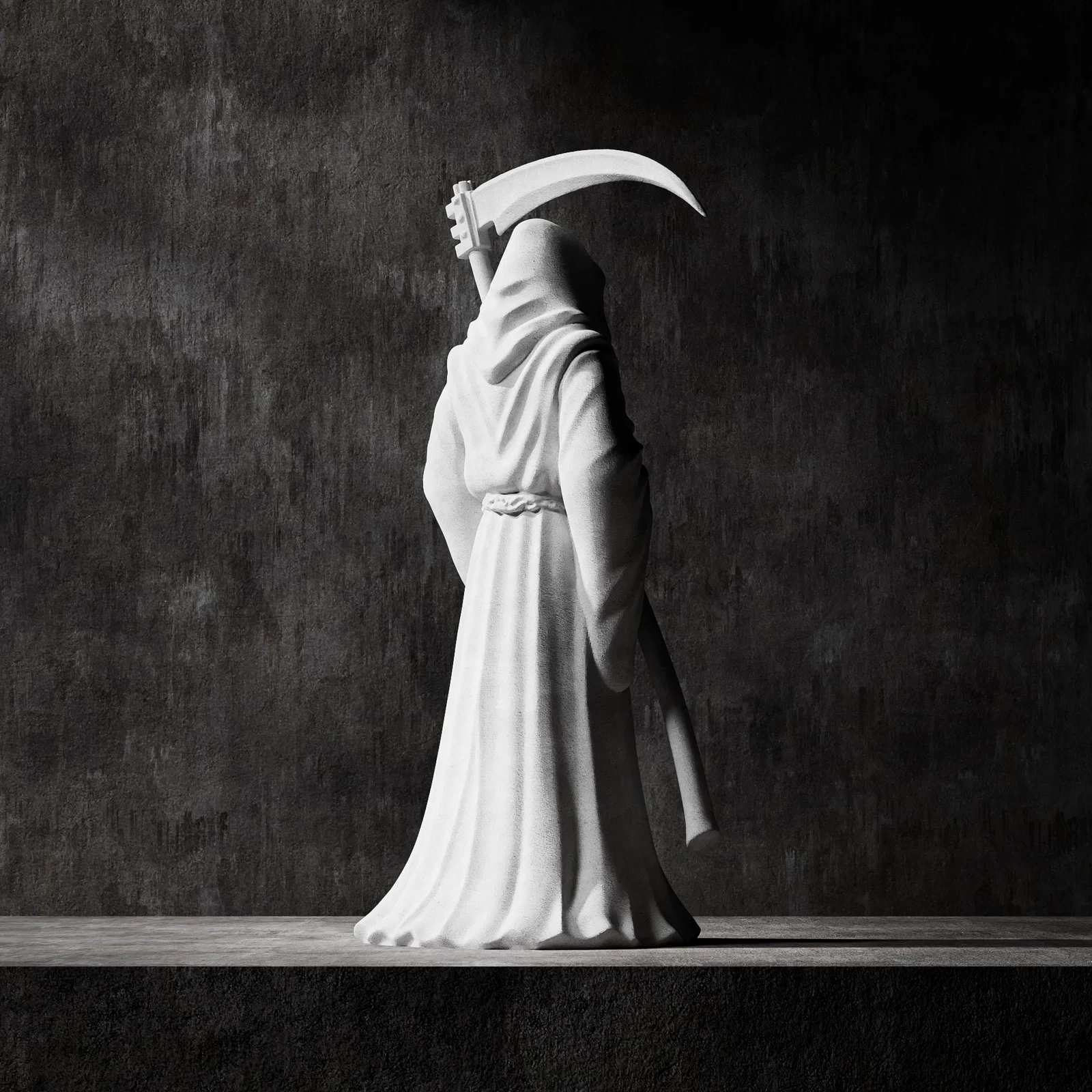 Một mẫu tượng Thần Chết Grim Reaper mang phong cách tối giản và đầy bí ẩn, với hình ảnh nhân vật trùm đầu không mặt đang cầm lưỡi hái. Phần tà áo bay bổng cùng hình khối mạnh mẽ giúp mô hình này trở nên hoàn hảo cho các thiết kế nội thất hiện đại hoặc theo phong cách Gothic.