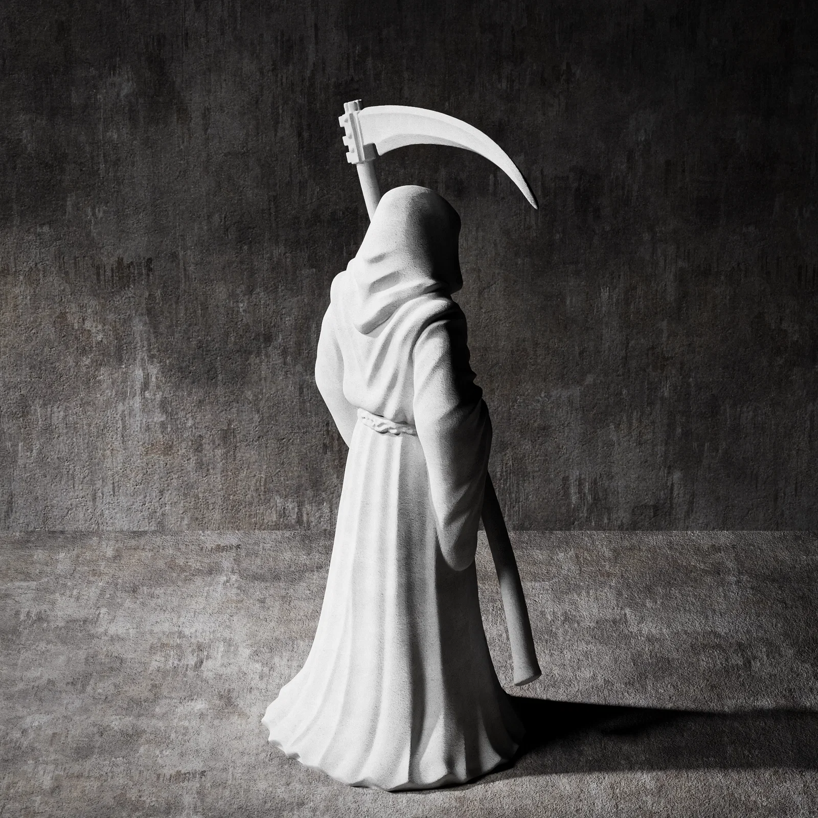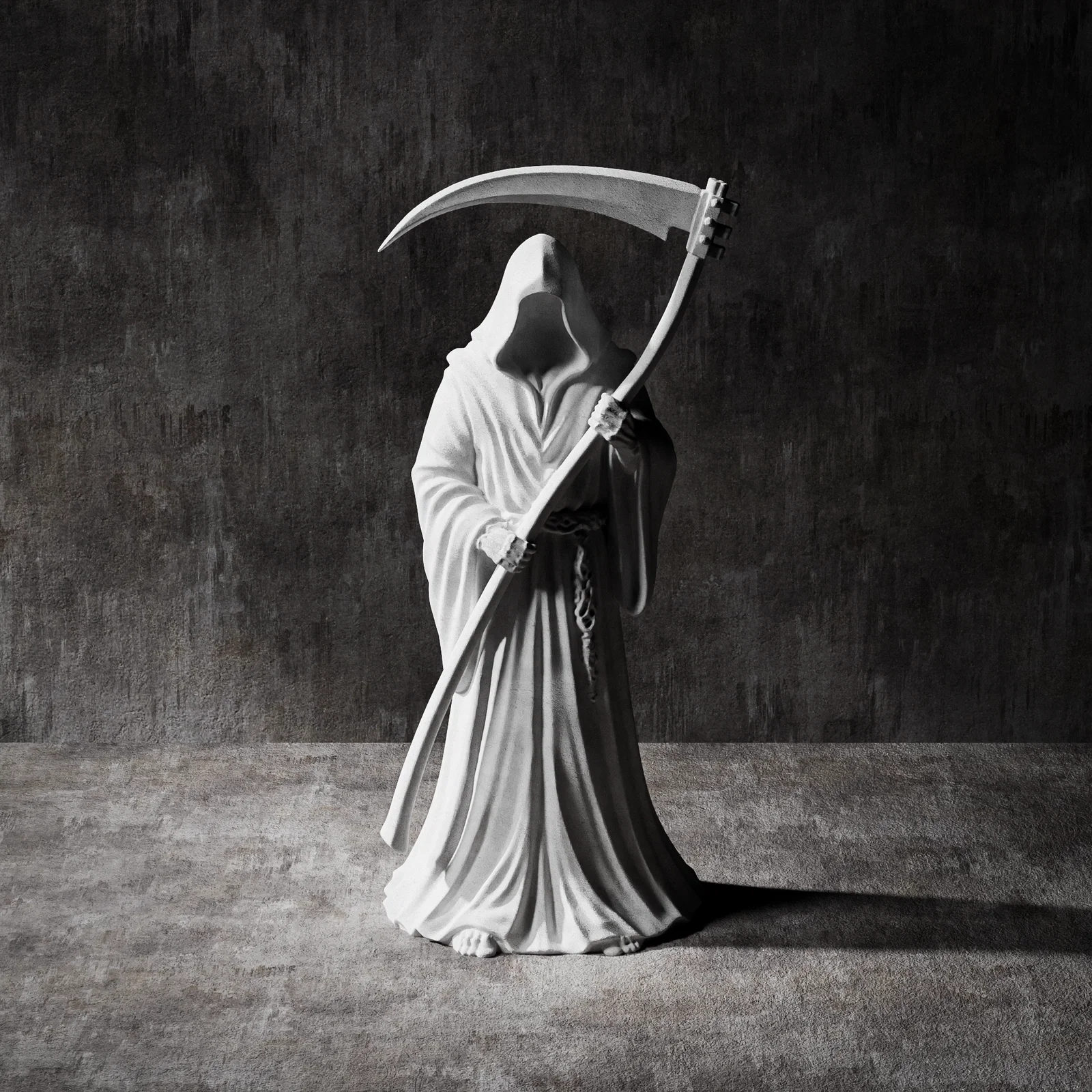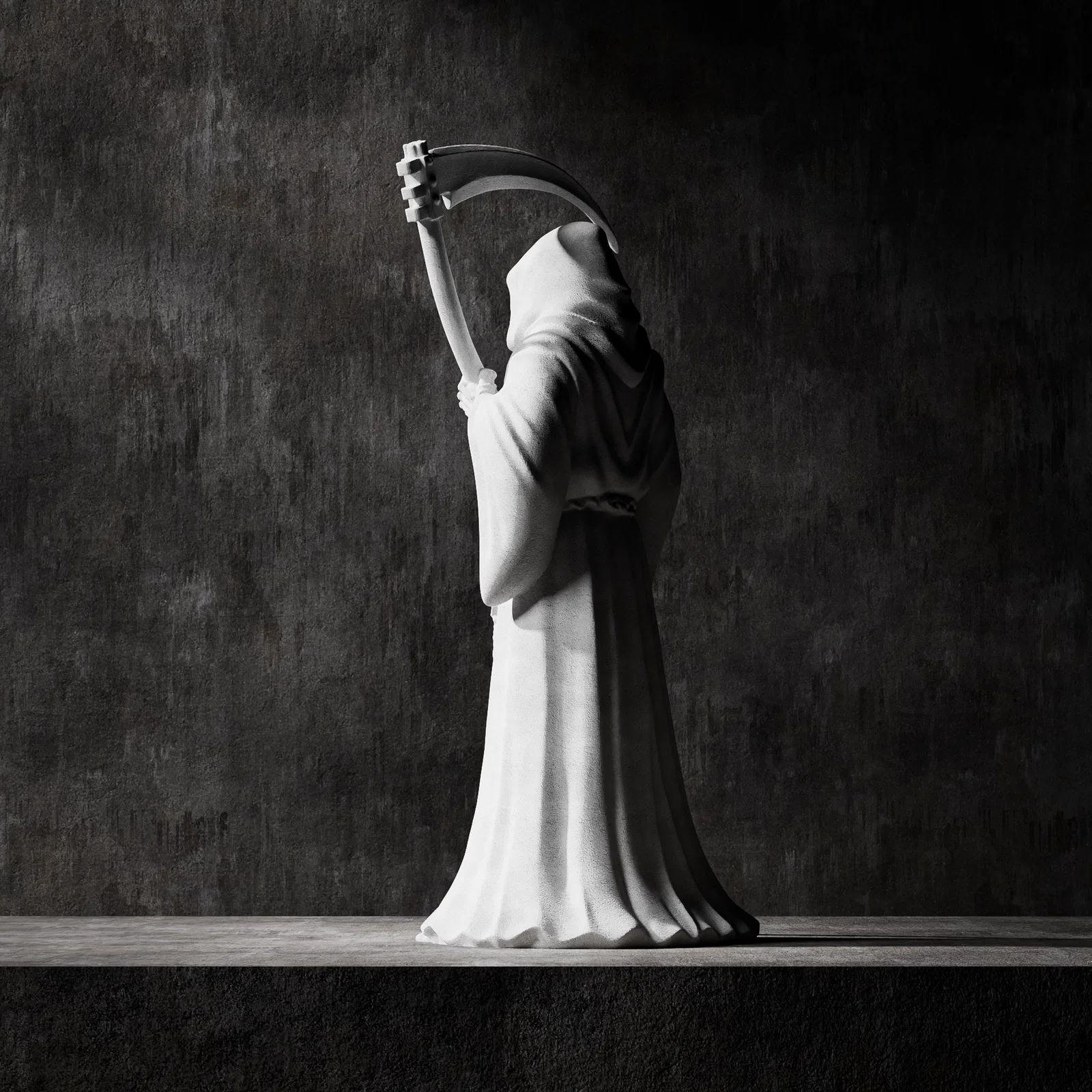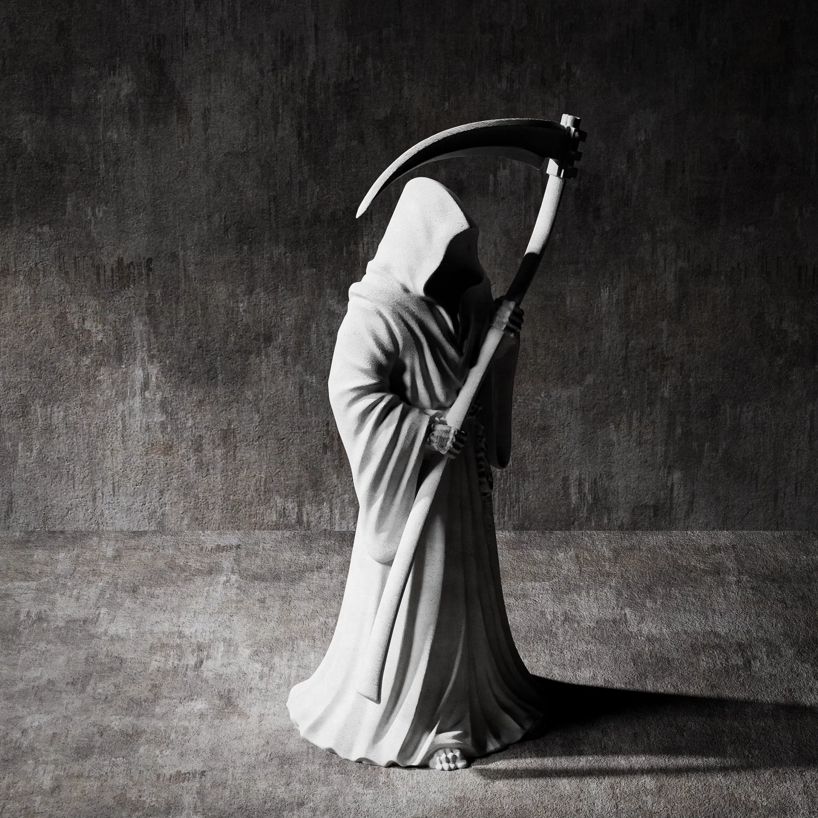 Một mẫu tượng Thần Chết Grim Reaper mang phong cách tối giản và đầy bí ẩn, với hình ảnh nhân vật trùm đầu không mặt đang cầm lưỡi hái. Phần tà áo bay bổng cùng hình khối mạnh mẽ giúp mô hình này trở nên hoàn hảo cho các thiết kế nội thất hiện đại hoặc theo phong cách Gothic.