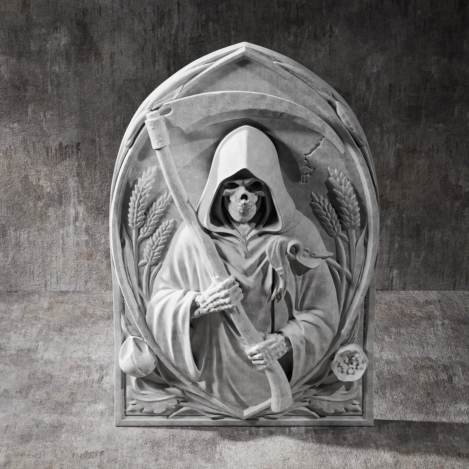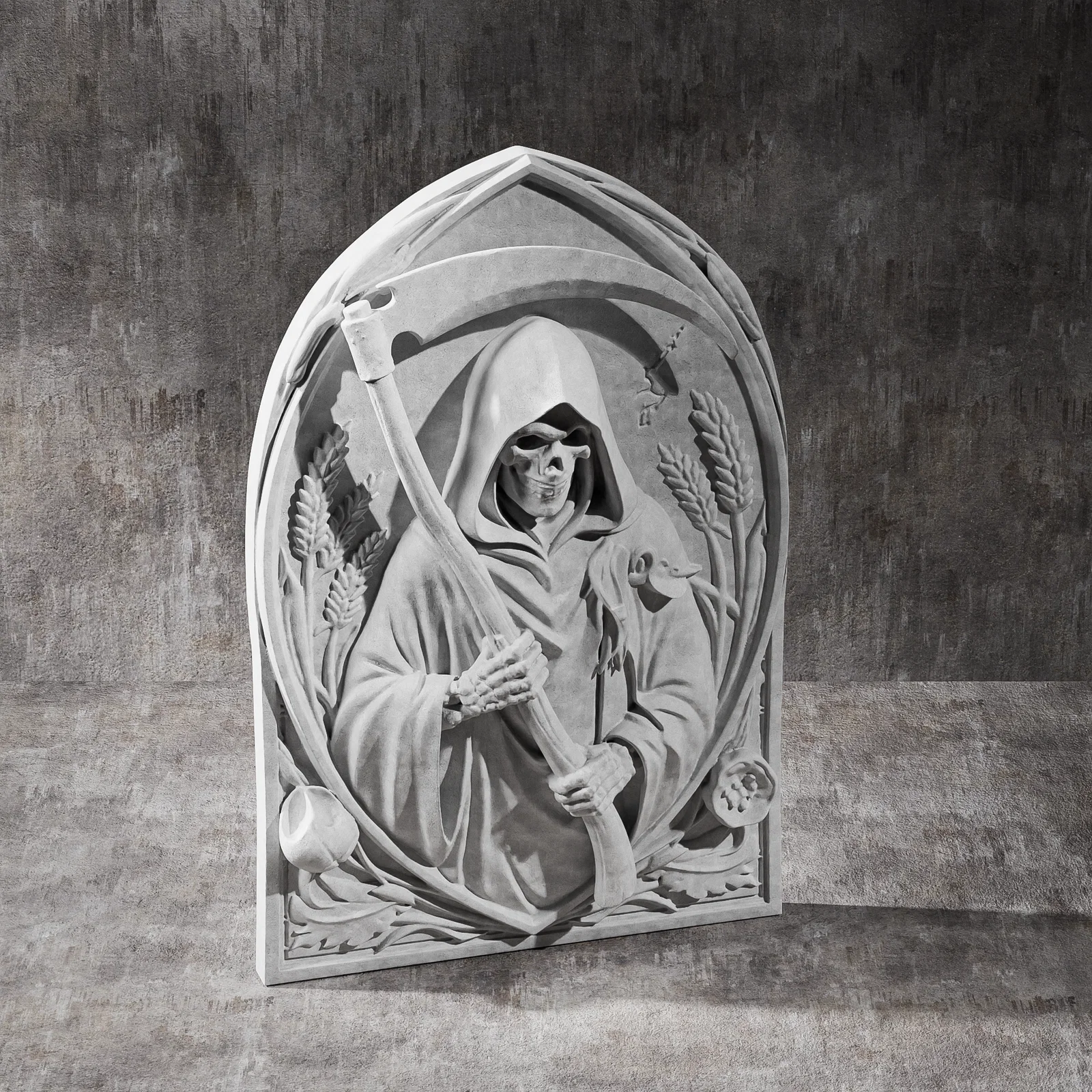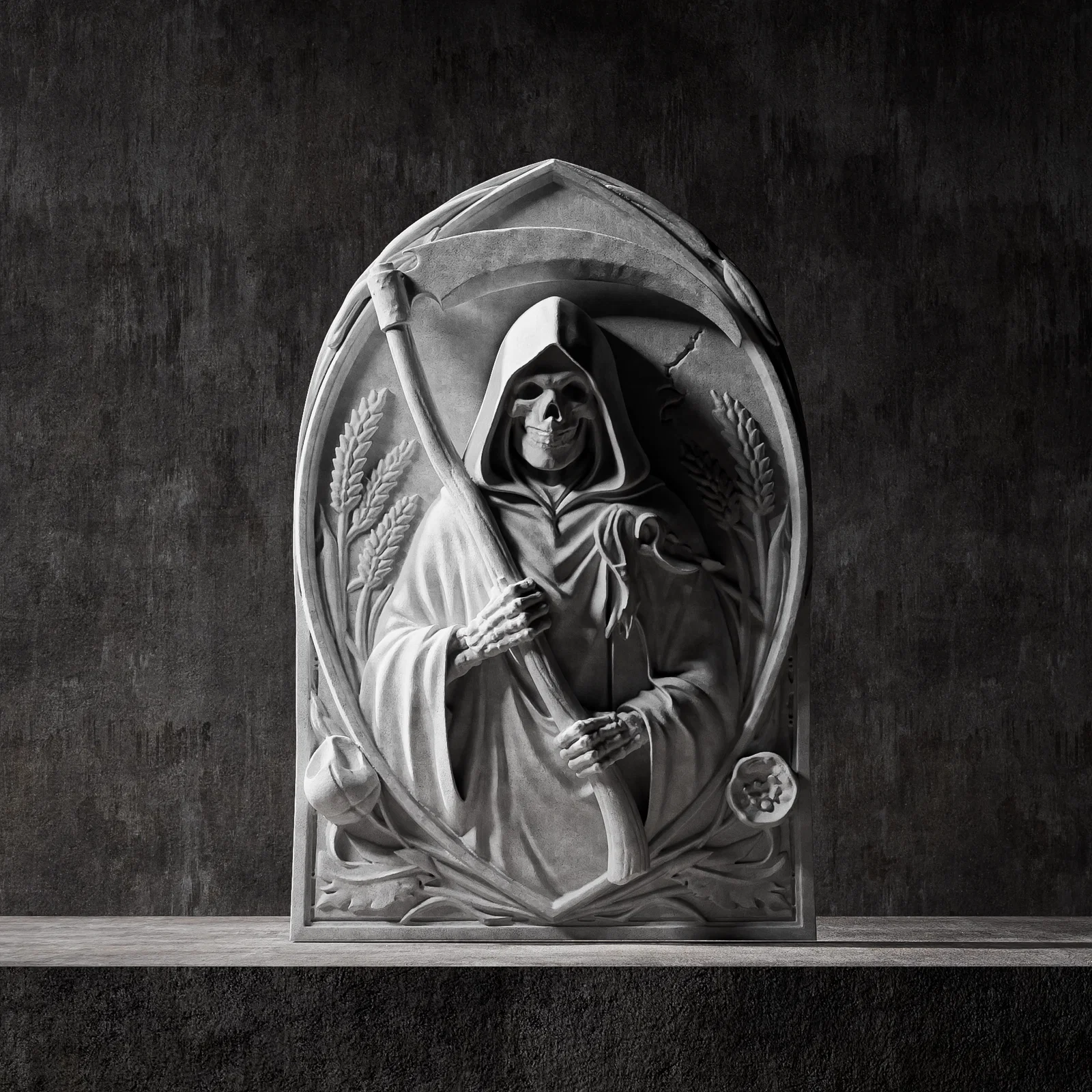 • Phù điêu Tử Thần cực kỳ chi tiết, được thiết kế chuyên biệt cho in 3D và điêu khắc CNC. Tấm ốp tường phong cách gothic này khắc họa hình ảnh bộ xương trùm khăn choàng cầm lưỡi hái, nằm bên trong một vòm trang trí cùng các biểu tượng như lúa mì và đầu lâu.