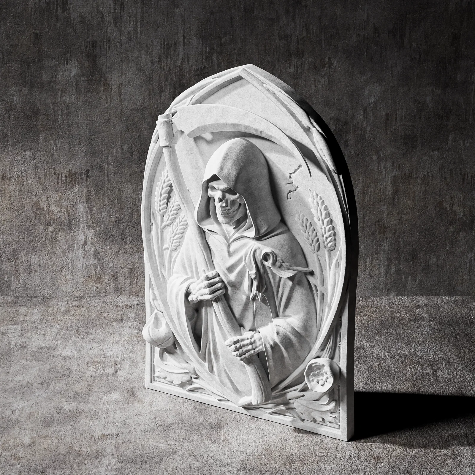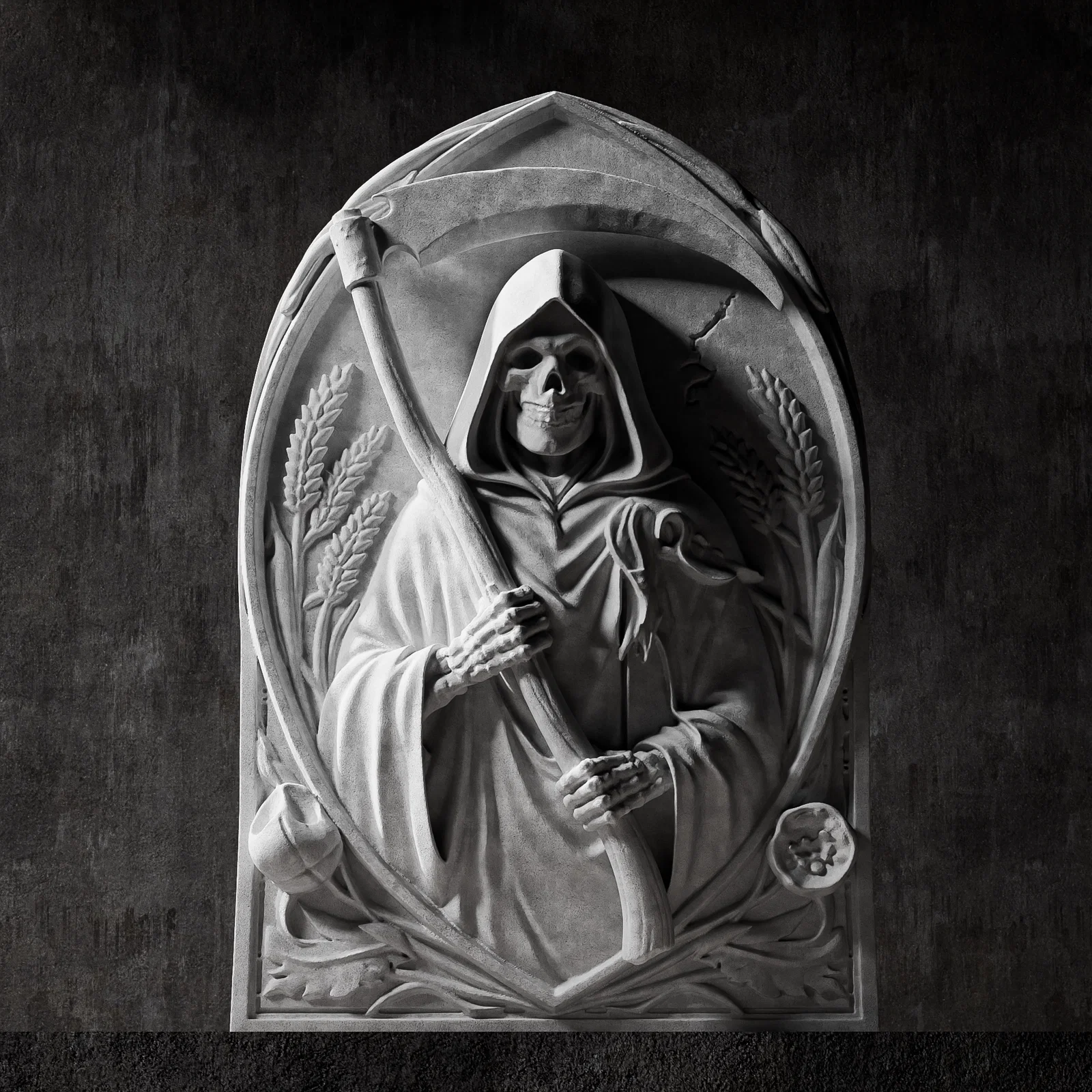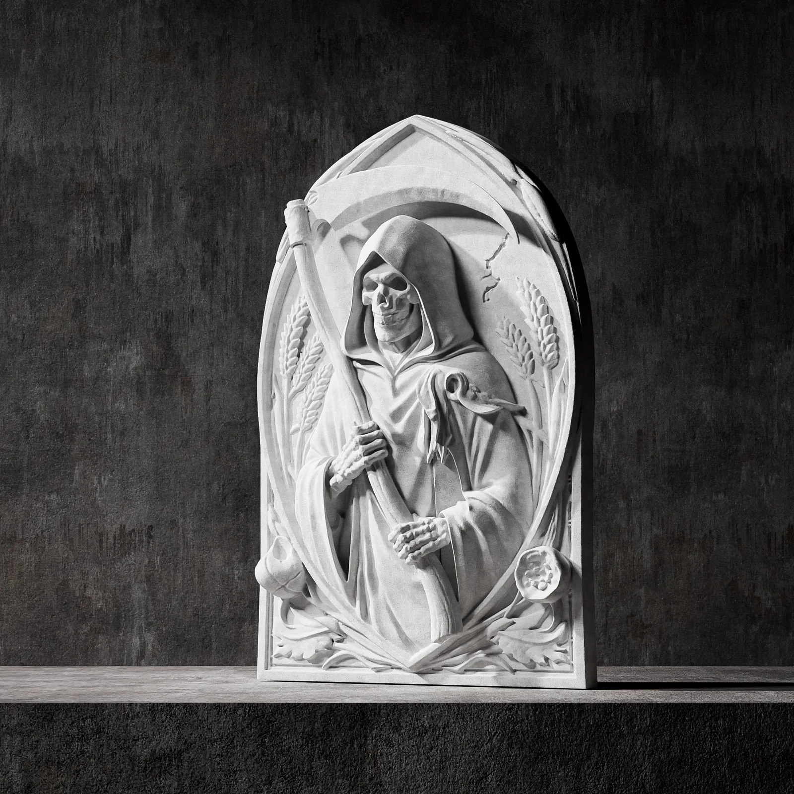 • Phù điêu Tử Thần cực kỳ chi tiết, được thiết kế chuyên biệt cho in 3D và điêu khắc CNC. Tấm ốp tường phong cách gothic này khắc họa hình ảnh bộ xương trùm khăn choàng cầm lưỡi hái, nằm bên trong một vòm trang trí cùng các biểu tượng như lúa mì và đầu lâu.