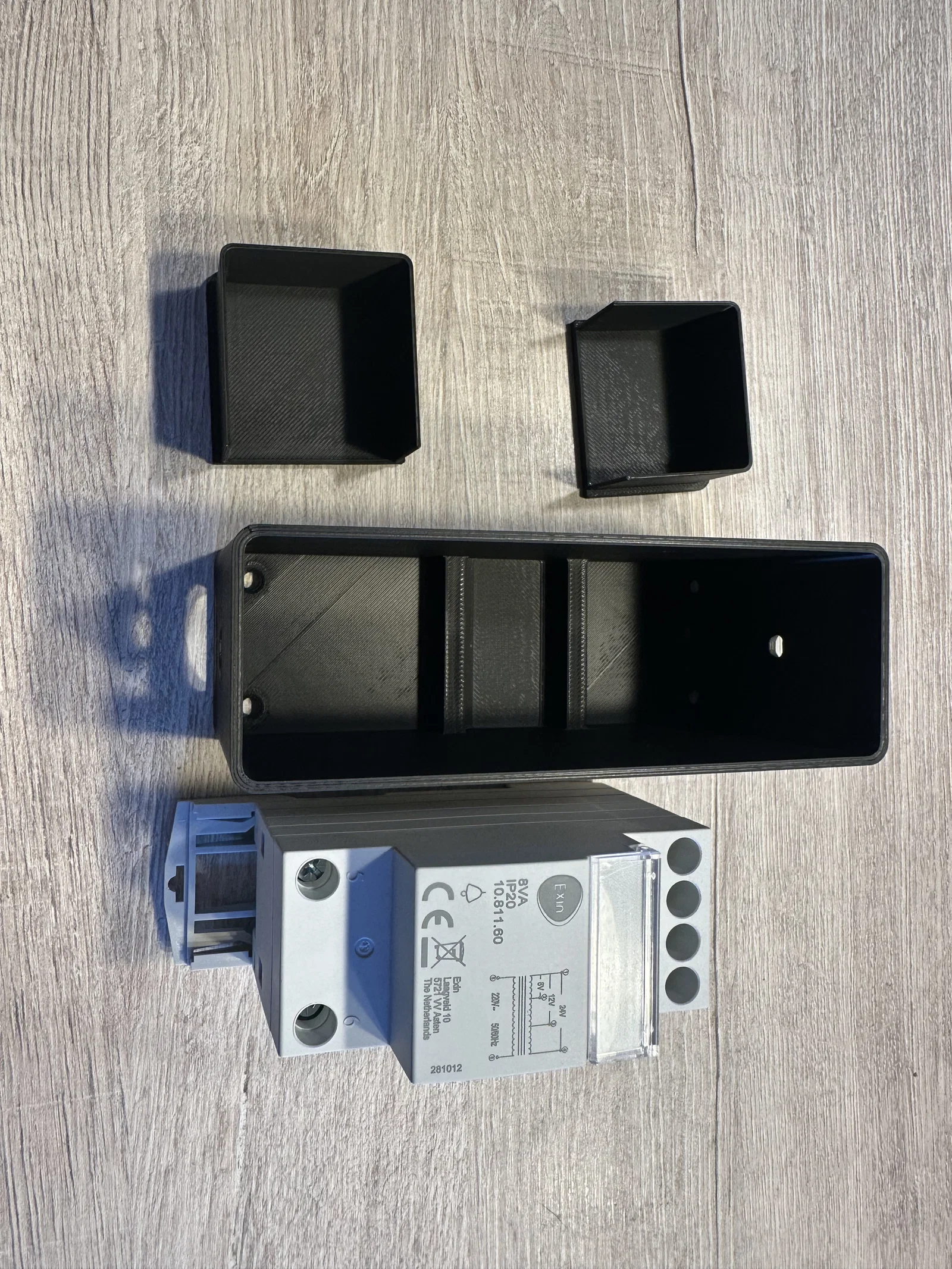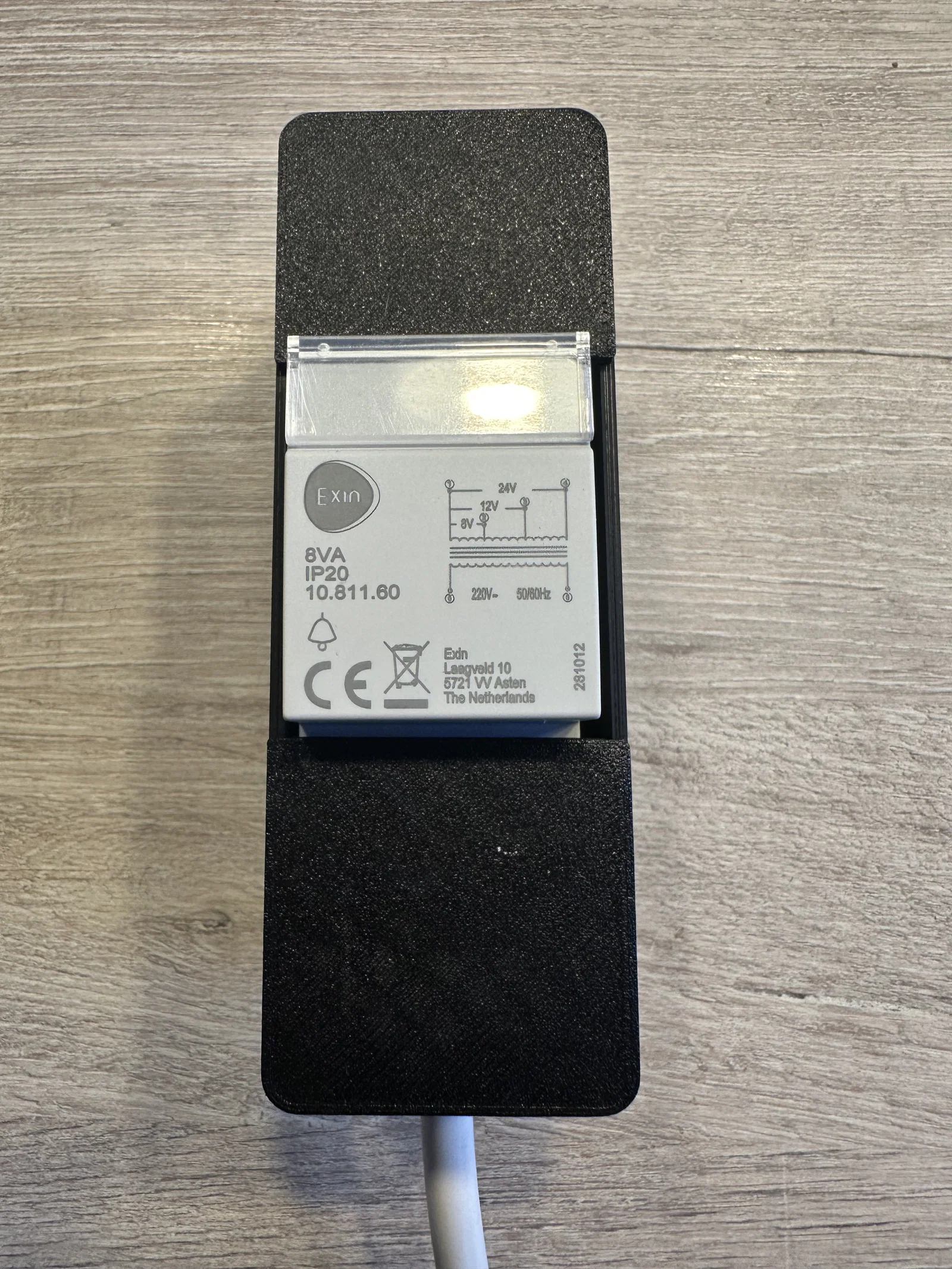 Hộp đựng chuyên dụng cho biến áp chuông cửa video sử dụng ray DIN 35mm. Thiết kế thông minh cho phép gắn module dễ dàng, hỗ trợ luồn dây điện và có nắp che bảo vệ an toàn. In tốt bằng PLA hoặc PETG mà không cần support.