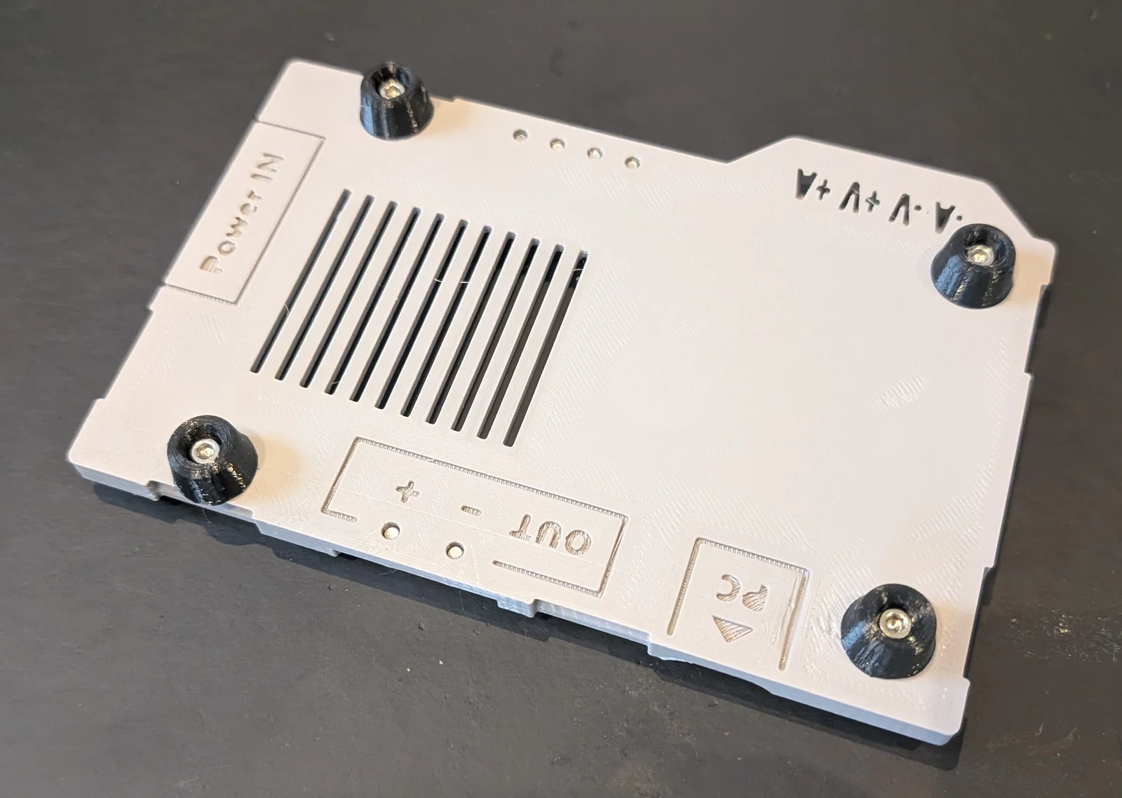 Theo yêu cầu của một người bạn, mình đã xem xét thiết kế của chiếc vỏ này. Dù thiết kế gốc rất tuyệt vời, nhưng sau khi nghe bạn mình mô tả về khả năng xử lý công suất, mình thấy việc bổ sung các khe thông gió bên dưới bảng mạch PCB sẽ là một cải tiến hợp lý, và vì vậy chúng ta cũng cần thêm chân đế để nâng thiết bị lên cao. Mình đã thiết kế các chân đế này cực kỳ đơn giản trên OpenSCAD để in bằng nhựa TPU 95A màu đen.