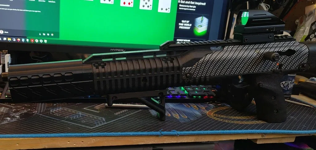 Cập nhật ngày 10/3/24 Đã thêm phiên bản mới với thành vách dày dặn hơn và các lỗ bắt vít mới. Mình vừa khoan và lắp thêm các đai ốc cấy nhiệt (heat set threaded inserts). THÊM NỮA! Giờ đây nó đã có thêm ngàm gắn picatinny. Hiện tại cảm giác rất chắc chắn và trông cực ngầu. Mình đang phát triển một phiên bản bao gồm đầu ren để gắn các phụ kiện khác như: bộ triệt lửa (flash suppressors), bộ bù giật (muzzle breaks), ống giảm thanh, v.v.