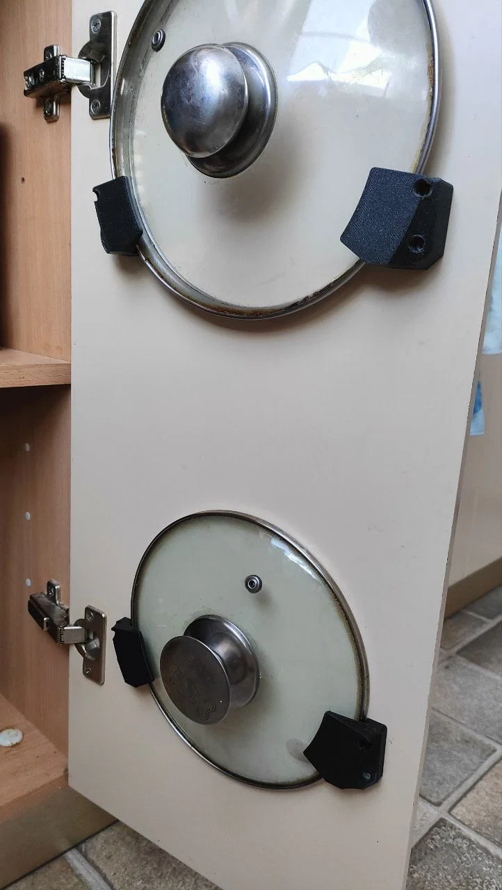 Mình thiết kế cái này dựa trên kích thước của cái nắp nồi lớn nhất trước, sau đó mới làm thêm các phiên bản thấp hơn cho những loại nắp nhỏ hơn. Nó phù hợp với hầu hết các loại nắp tròn hoặc đồ vật có hình dáng tương tự. Nếu bạn thấy nó hơi lỏng, có thể cần dùng thêm băng keo xốp nhé—chỉ có một cái nắp phẳng của mình là cần dùng đến nó thôi, còn mấy loại khác thì đặt vào rất vừa vặn. Để có kết quả tốt nhất, bạn nên ướm thử và căn chỉnh mọi thứ trên bàn trước khi lắp cố định vào cánh tủ.