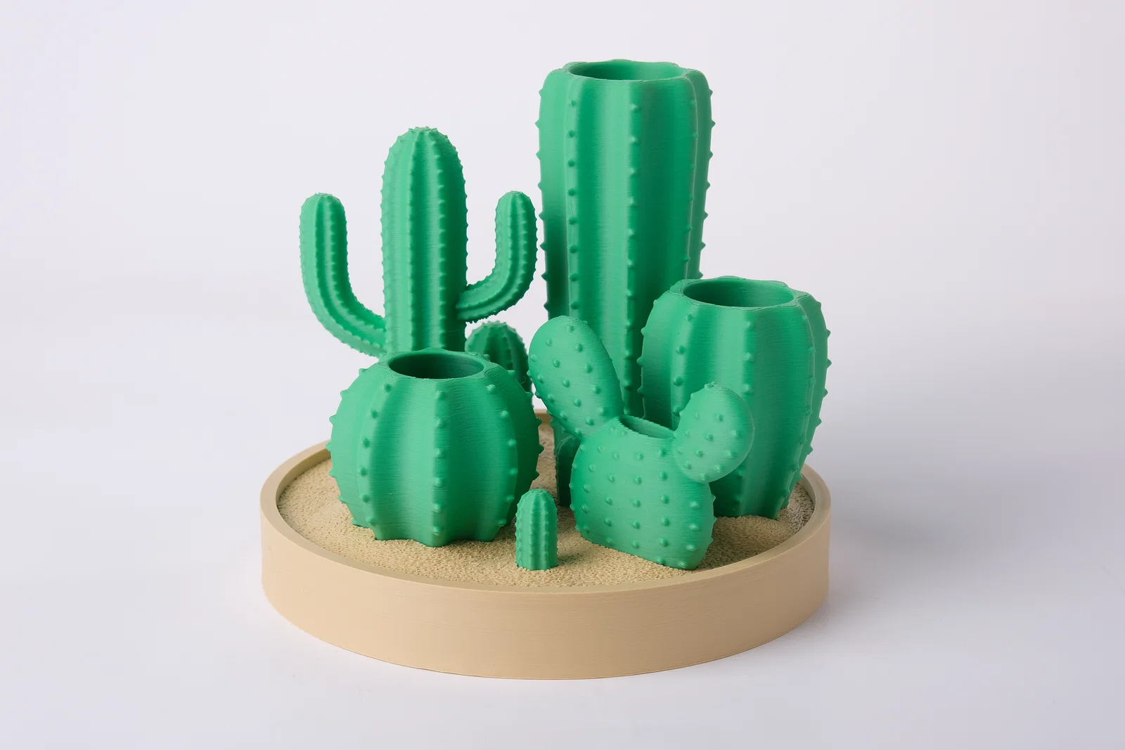 Cái khay đựng đồ này được thiết kế theo phong cách tiểu cảnh sa mạc, giúp góc làm việc của bạn luôn gọn gàng và ngăn nắp. Sản phẩm bao gồm nhiều loại xương rồng khác nhau, như cây xương rồng Saguaro cổ điển, xương rồng cột cao, xương rồng tai thỏ (prickly pear) và hai cây xương rồng tròn. Những cây cao có phần miệng hở ở phía trên để bạn cắm bút, cọ trang điểm, còn những cây thấp và rộng hơn thì dùng để đựng ghim giấy hoặc thẻ nhớ SD là cực kỳ hợp lý. Tất cả được đặt trên một cái đế tròn giống như một khay cát. Đây là cách cực kỳ thú vị để thêm chút sắc xanh cho bàn làm việc mà không cần phải lo tưới nước hay chăm sóc cây thật.