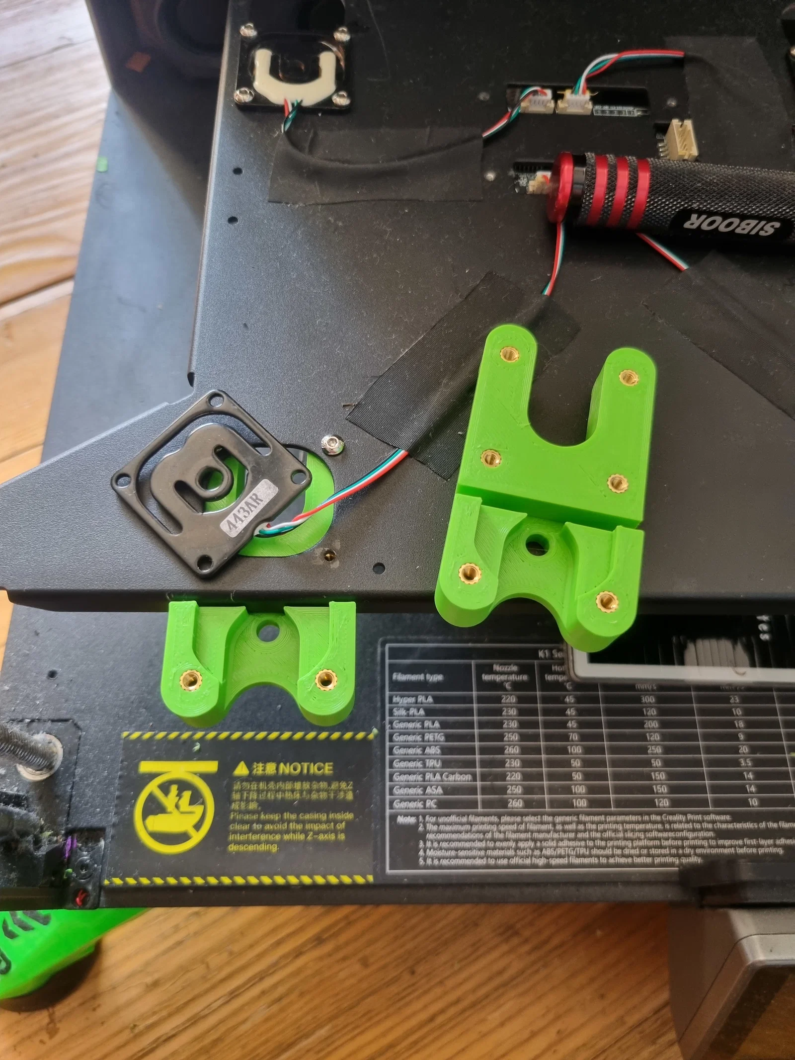 Bộ phận và hướng dẫn chi tiết để dời bàn nhiệt cho máy in 3D dòng K1 sau khi nâng cấp Dragonburner. Giải pháp xử lý độ chênh lệch chiều cao và điều chỉnh vị trí bàn in để khớp với đầu phun mới.