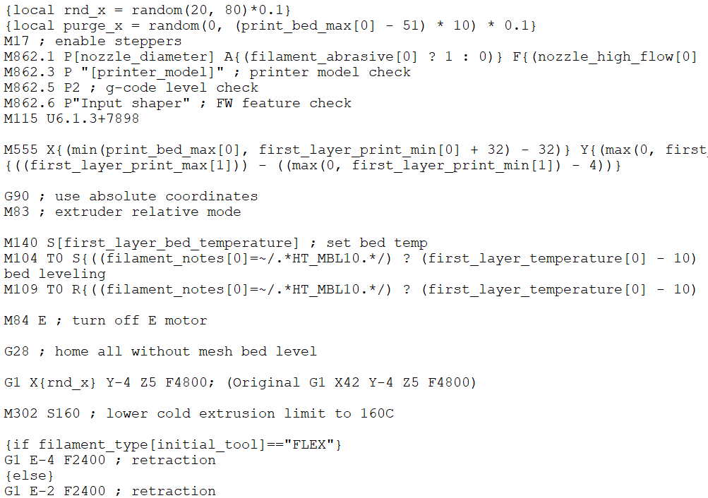 Đoạn G-Code này giúp tạo một biến X ngẫu nhiên để xác định vị trí bắt đầu của vạch purge (làm sạch đầu phun), giúp tránh mòn bề mặt bàn in tại một điểm cố định.