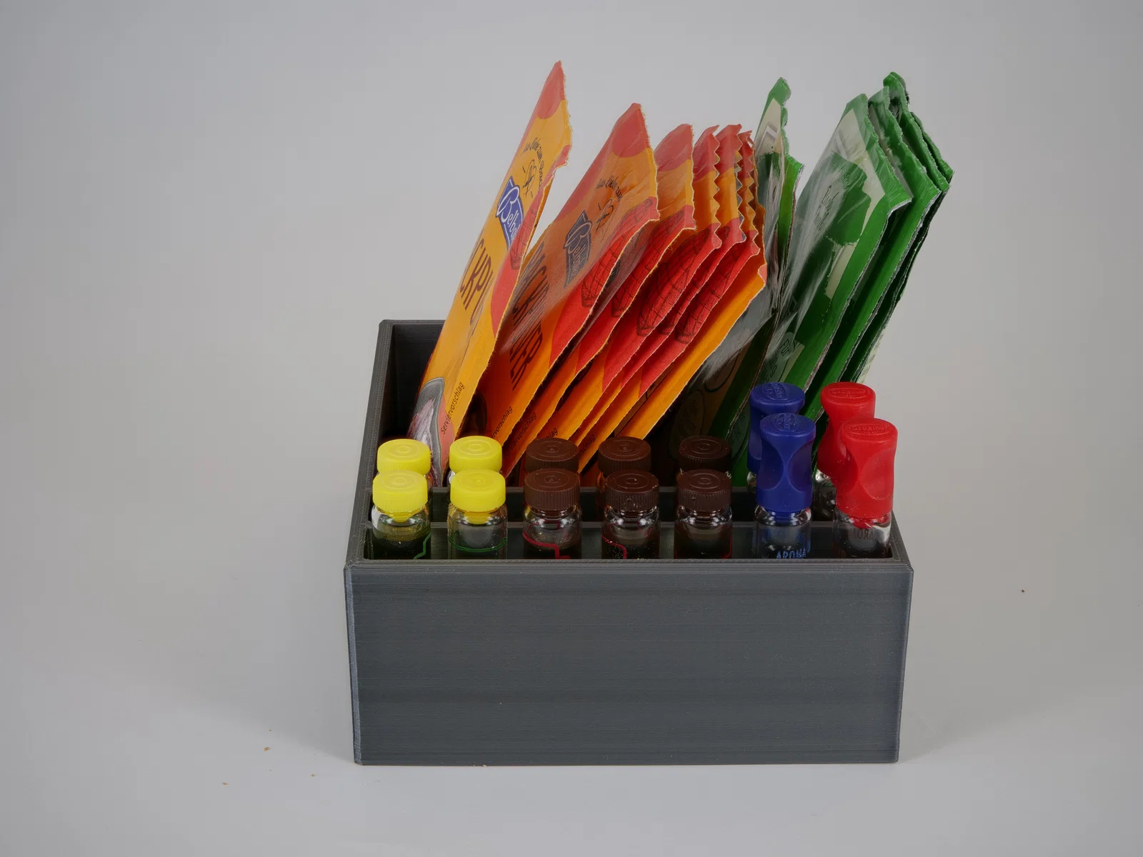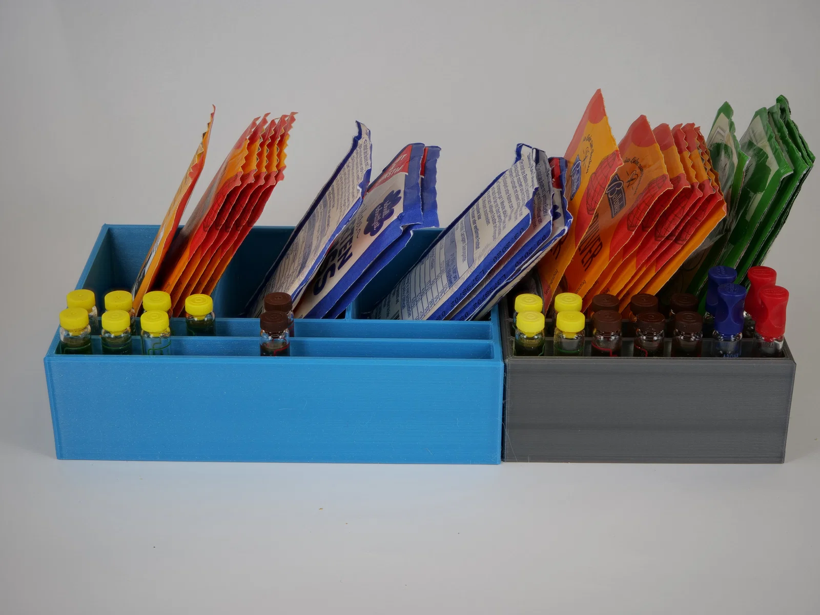 - Hộp lớn: Có chiều dài 148 mm, đủ chỗ cho 22 chai hương liệu và có ba ngăn riêng để đựng bột nở.