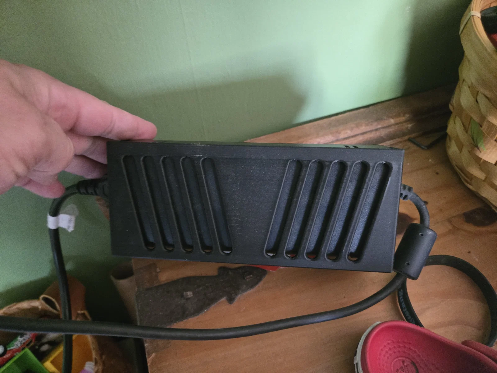 Đây là mẫu giá treo tường cho cục nguồn (power brick) mà mình đã nhanh chóng thiết kế. Nó có các khe thông gió và mình thấy dùng rất tốt cho máy Xbox 360 của mình. Mình không hề thấy máy bị nóng hơn so với trước đây. Bạn có thể chọn gắn lên tường bằng miếng dán Command Strips hoặc dùng vít đều được nhé.