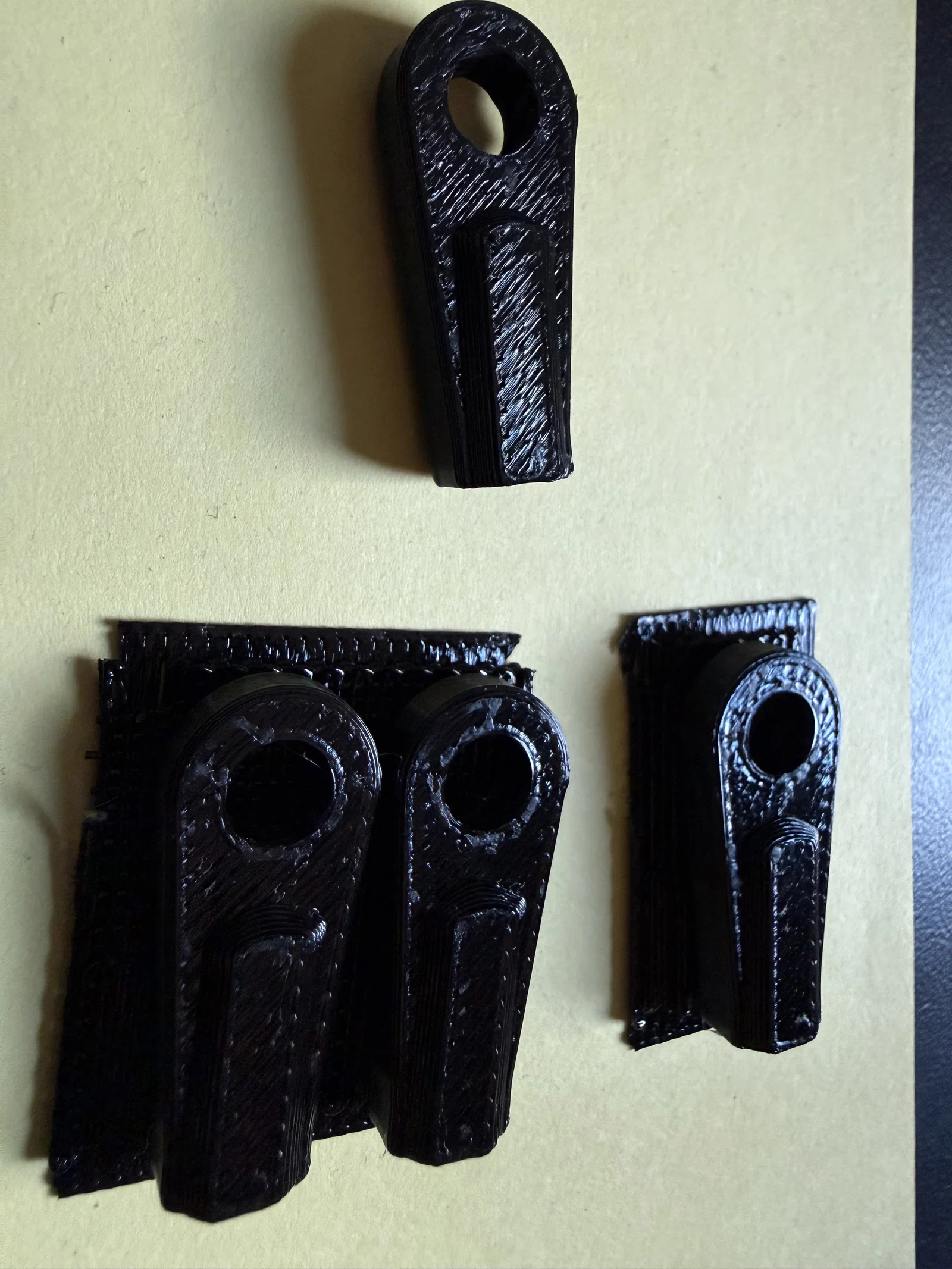 Mình đã in thử bằng nhựa Overture High Speed TPU và cả loại Overture TPU thường mềm hơn. Loại TPU thường thì dẻo hơn hàng zin một chút, nhưng loại High Speed thì độ cứng gần như tương đương. Mình thấy nó không ảnh hưởng nhiều đến khả năng điều khiển xe, dù hiện tại mình đang dùng 2 cái bằng nhựa mềm. Rủi ro duy nhất là phần ren có thể bị toét, nhưng lực tác động theo hướng đó không đáng kể nên mình nghĩ không thành vấn đề đâu.