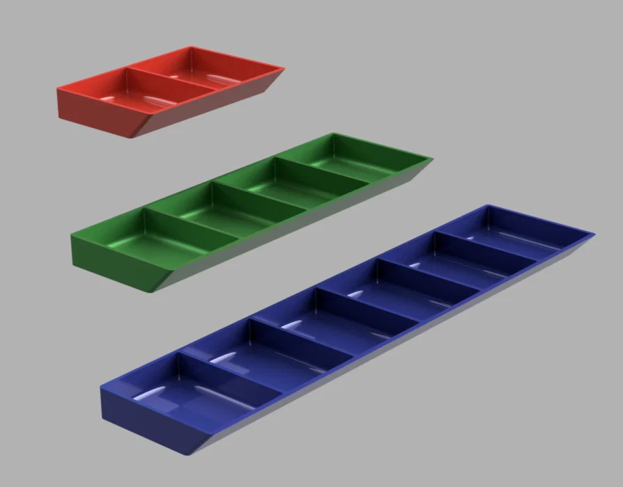 Những chiếc khay đơn giản dùng để sắp xếp ốc vít và linh kiện nhỏ khi làm việc. Thiết kế tiện dụng với mặt trước vát nghiêng giúp lấy đồ dễ dàng. Có sẵn các mẫu 2, 4 và 6 ngăn để bạn tải về và in ấn nhanh chóng.