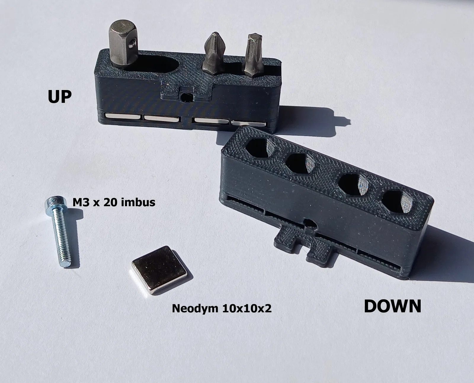 - Yêu cầu linh kiện: Để cố định mũi vít, cần chuẩn bị nam châm Neodymium kích thước 10x10x2 mm. Để bắt khay vào thân máy, hãy sử dụng ốc vít M3 x 20 đầu trụ (imbus).