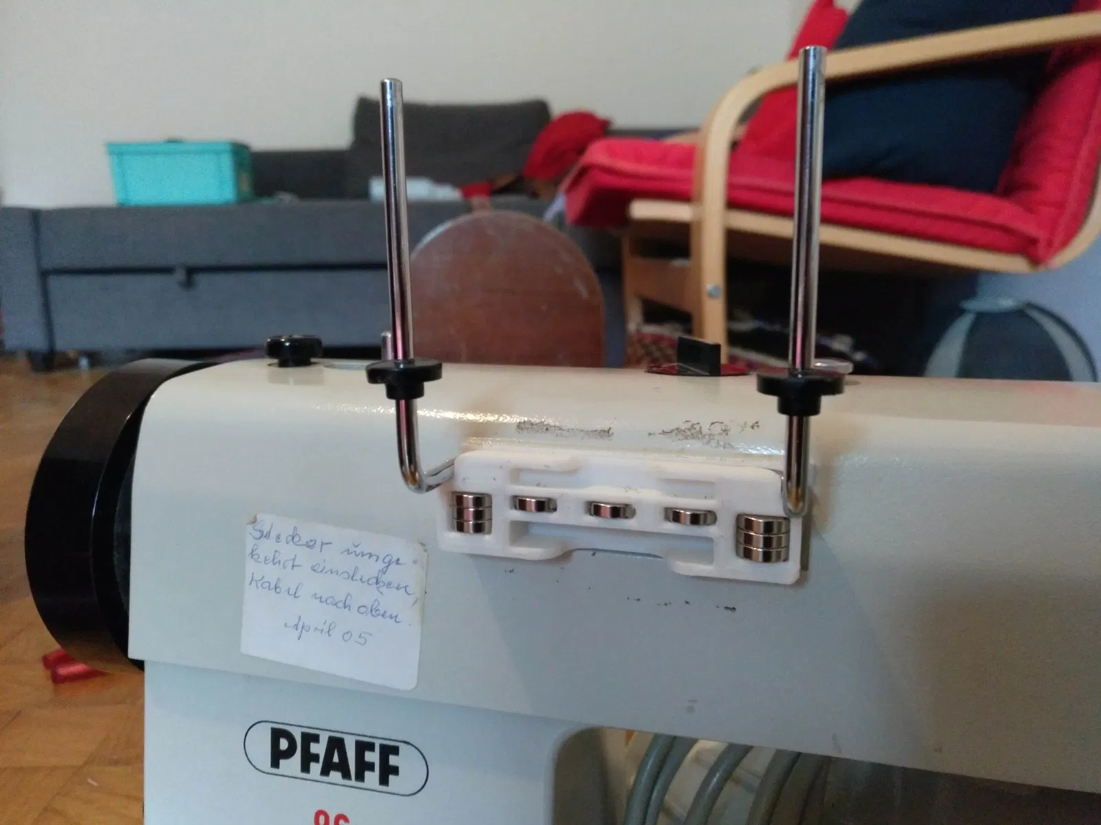 Phần nhựa cứng cũ đã bị gãy vì máy may được cất giữ với giá đỡ cuộn chỉ đang gắn vào. Trong thiết kế từ tính này, điều này được ngăn chặn vì giá đỡ cuộn chỉ sẽ tự động tách ra trong trường hợp có lực tác động bên ngoài.