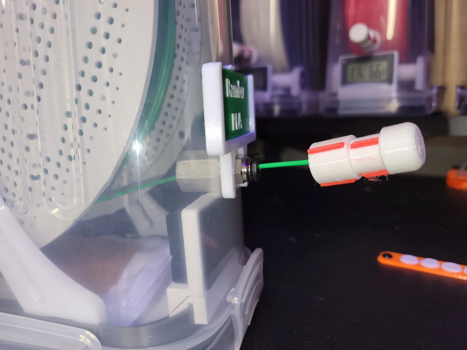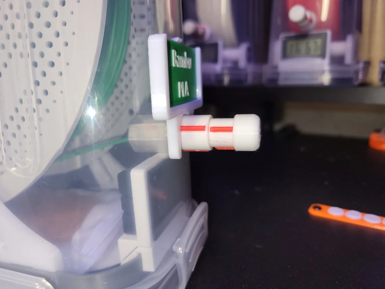 Nắp đậy này là phụ kiện hoàn hảo cho mọi loại hộp chống ẩm, có hoặc không có hệ thống tự thu sợi nhựa (như mẫu Auto-Rewinder của tôi). Nó giúp giữ đầu sợi nhựa không bị tuột vào trong hộp khi không sử dụng và đậy kín đầu nối PC4-M10. Sản phẩm tương thích với mọi loại nhựa, kể cả TPU.