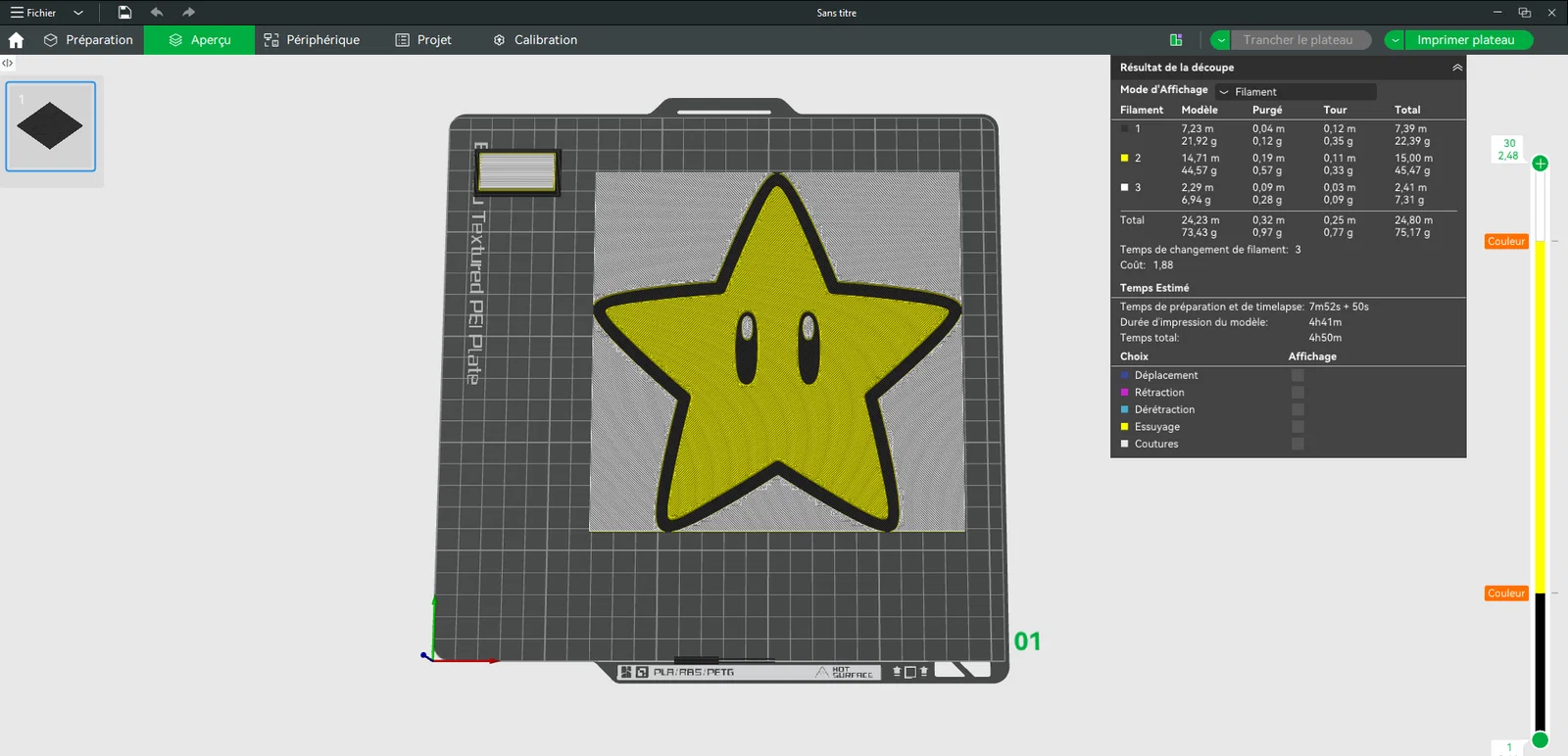 - Tại lớp thứ 8 (0,72 mm), chuyển sang BambuLab Basic Yellow