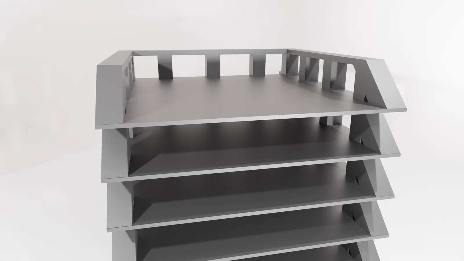 Thiết kế đơn giản cho các loại khay/kệ xếp chồng, giúp bạn tận dụng không gian để sắp xếp đồ đạc. Bộ sản phẩm bao gồm 2 mẫu khác nhau: một loại dùng để xếp chồng lên nhau và một loại nắp trên cùng không có phần khớp nối. Các khay này được thiết kế với các lỗ nhỏ để cố định, đảm bảo sự chắc chắn và tránh bị trượt hay rơi đổ. Lưu ý là kích thước khay không đủ lớn để chứa giấy A4 (8.5 x 11 inch), nhưng lại rất tiện lợi để đựng các món đồ nhỏ như bút màu, hộp phụ kiện và nhiều vật dụng cá nhân khác.