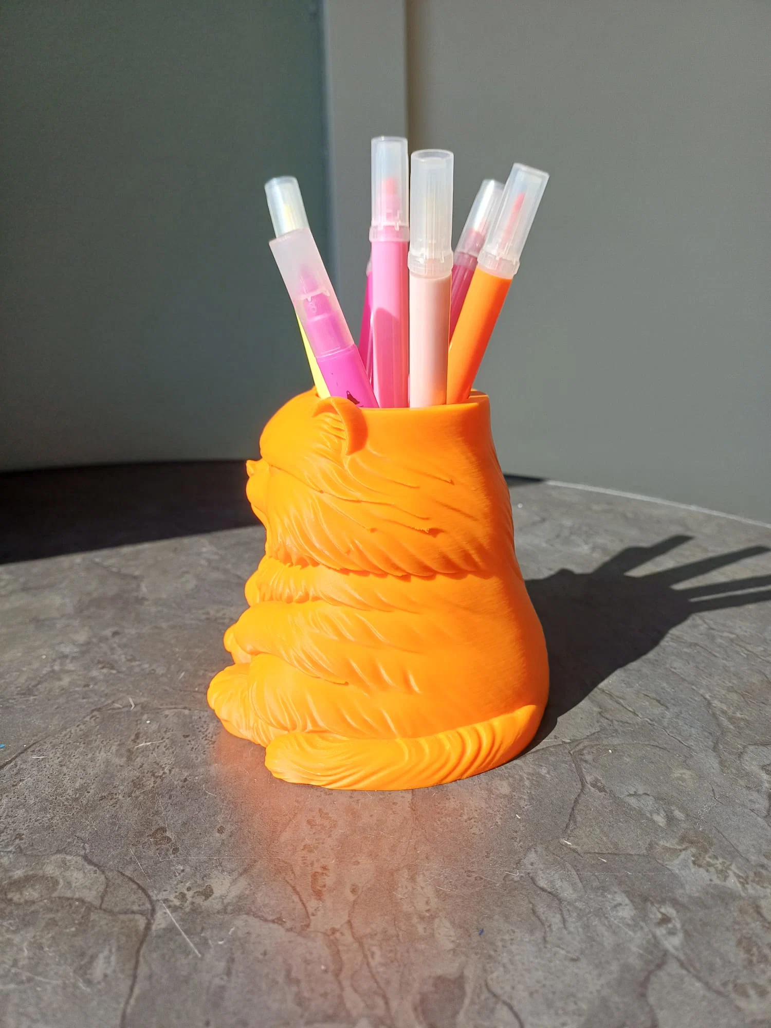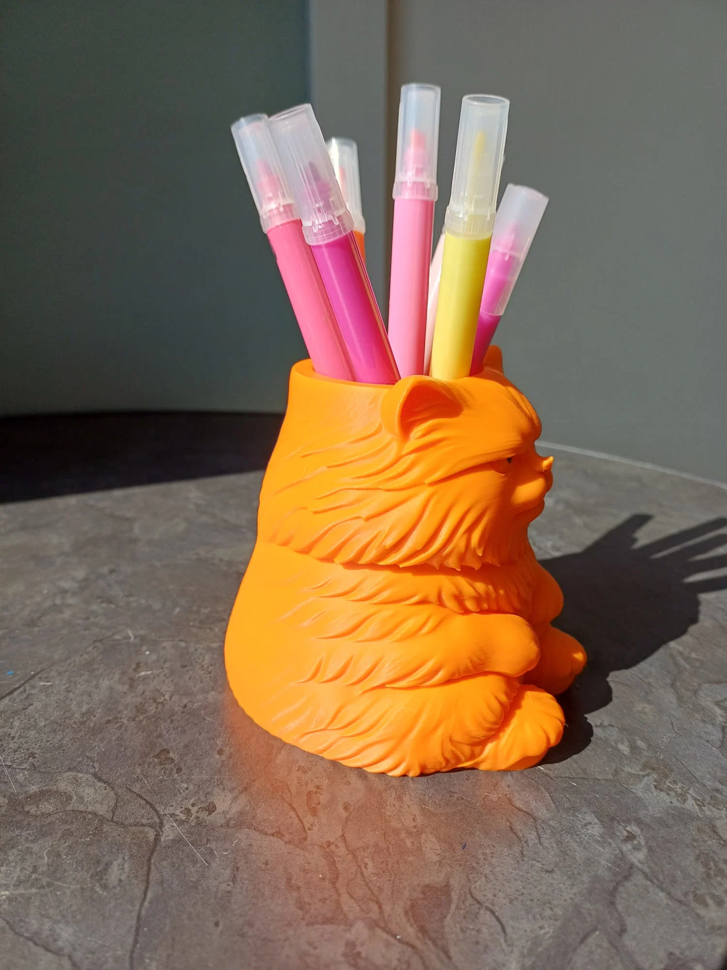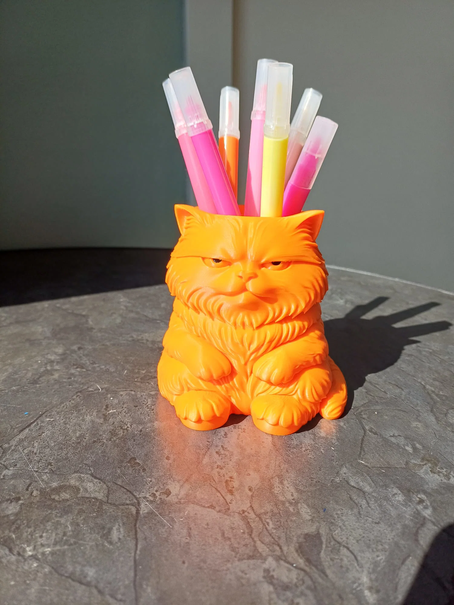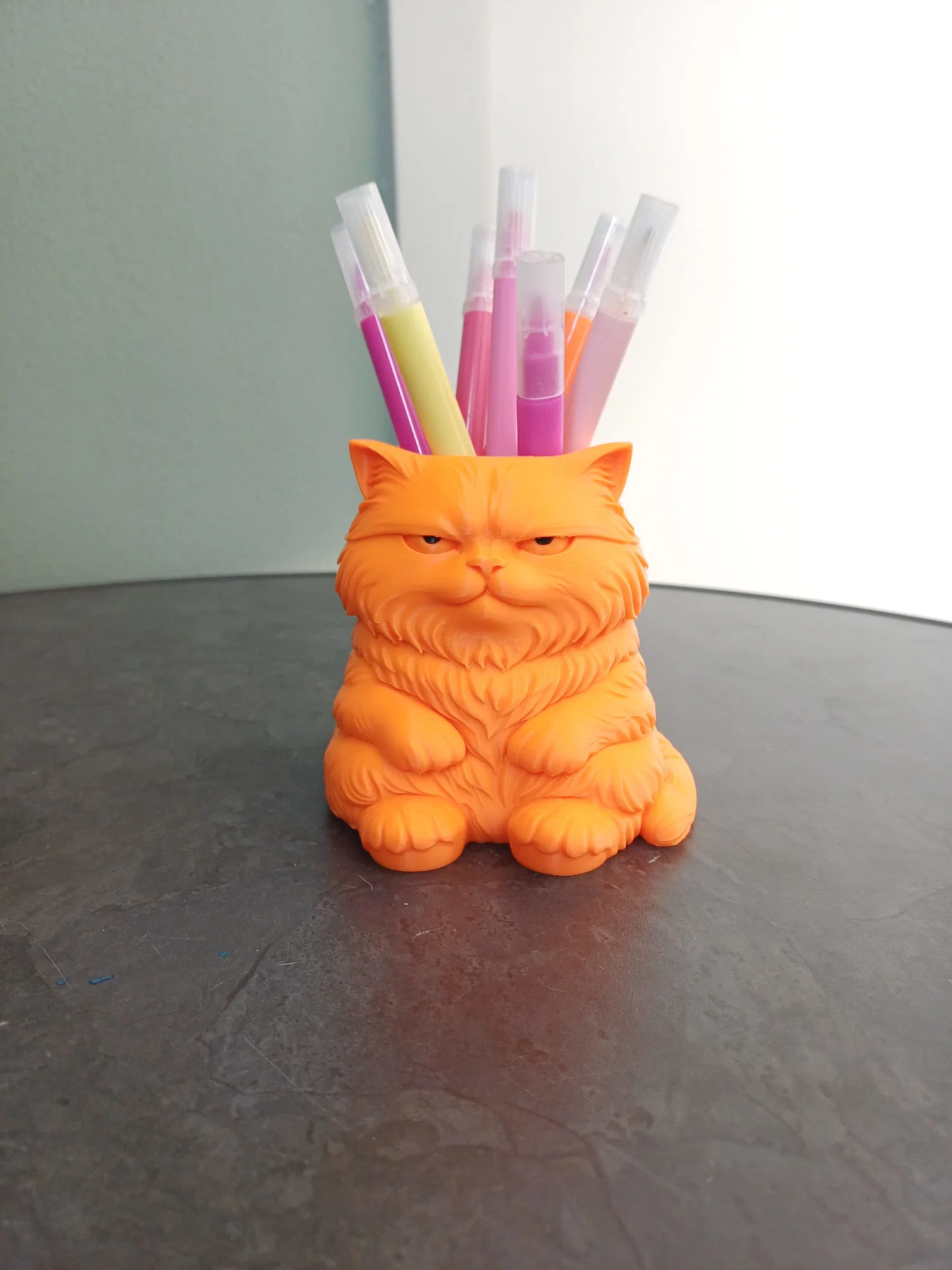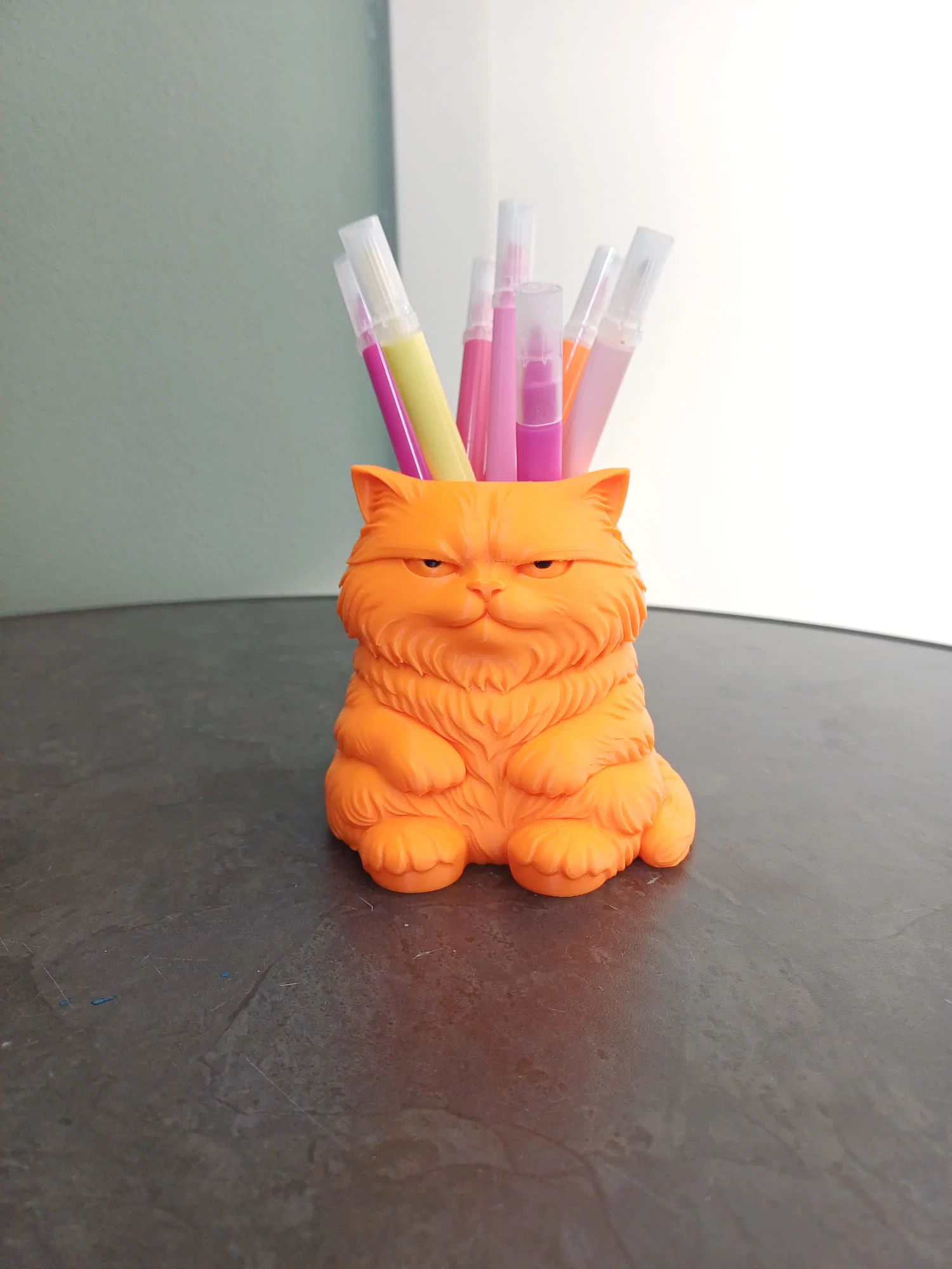 Ống cắm bút hình mèo quạu quọ cực xinh giúp bàn làm việc của bạn thêm gọn gàng. In ở độ phân giải 0.16mm, 3 walls, 10% infill, có hỗ trợ supports. File 3mf có sẵn màu mắt, file stl cần tự tô màu.