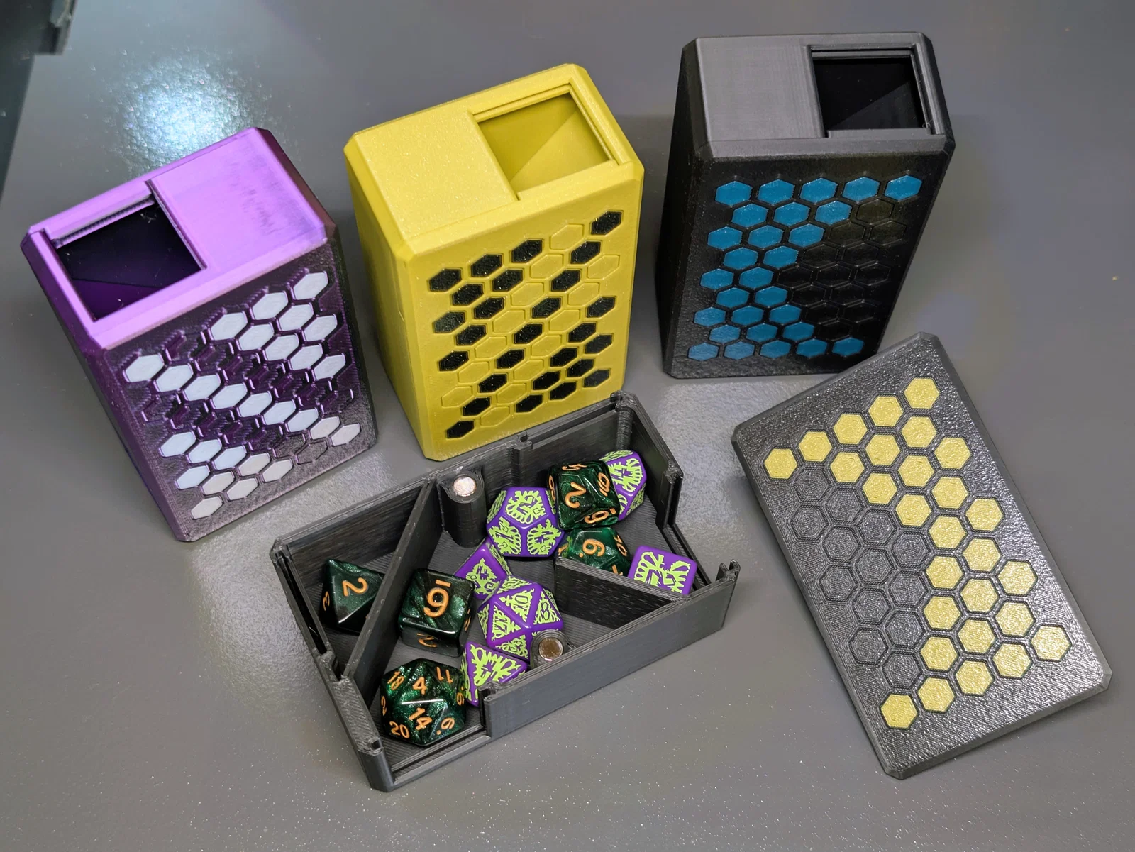 Hộp đựng xúc xắc đơn giản có thể chứa hai bộ xúc xắc và cũng dùng được như một tháp đổ xúc xắc (dice tower).