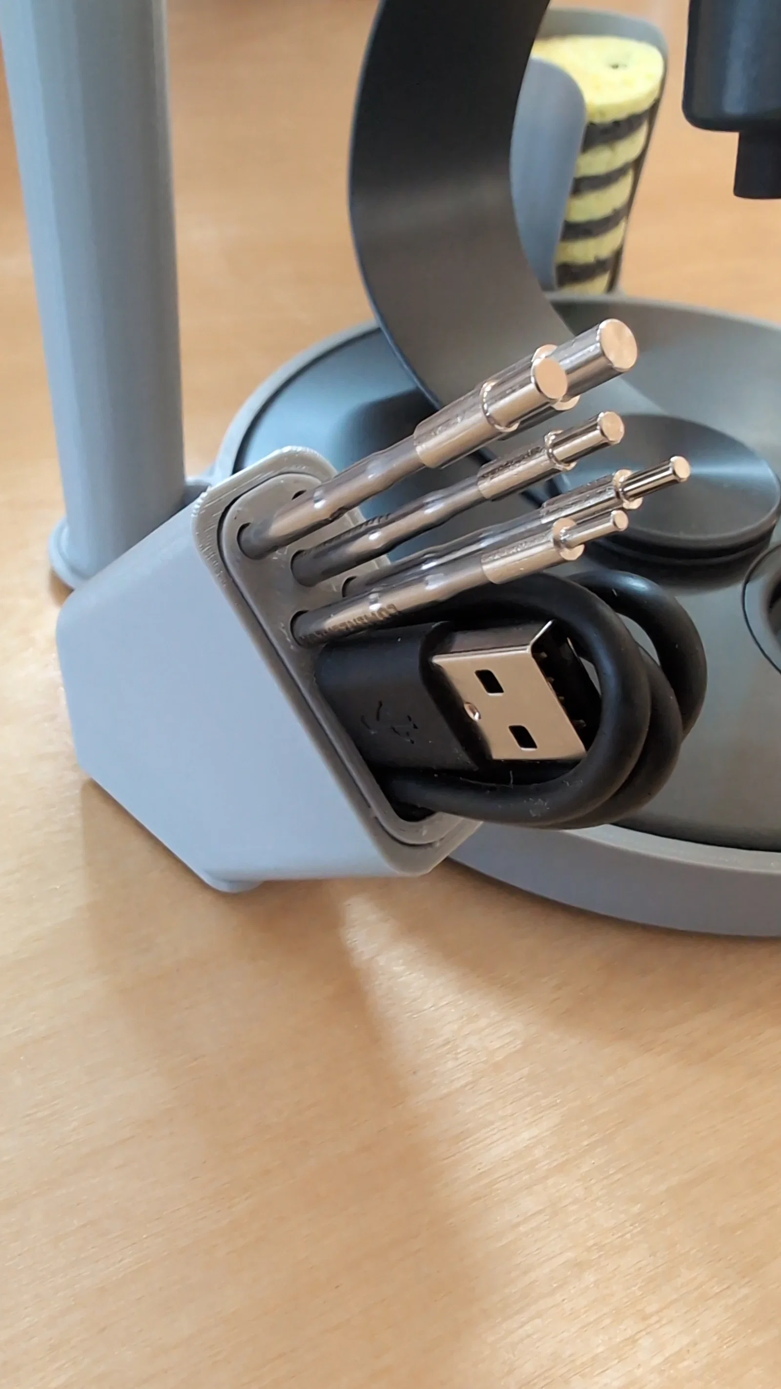Nếu anh em đang sở hữu trạm hàn Fanttik và gặp khó khăn trong việc quản lý các đầu hàn nhỏ, thì phụ kiện in 3D này chính là giải pháp cực kỳ tiện lợi dành cho anh em. Đây là một thiết kế thông minh, đóng vai trò như một miếng chèn (insert) vào phần giữ dây cáp của trạm hàn, giúp tận dụng không gian trống để lưu trữ gọn gàng. Thay vì để các đầu hàn lăn lóc trên bàn làm việc dễ gây thất lạc, anh em có thể cắm chúng thẳng đứng vào phụ kiện này.