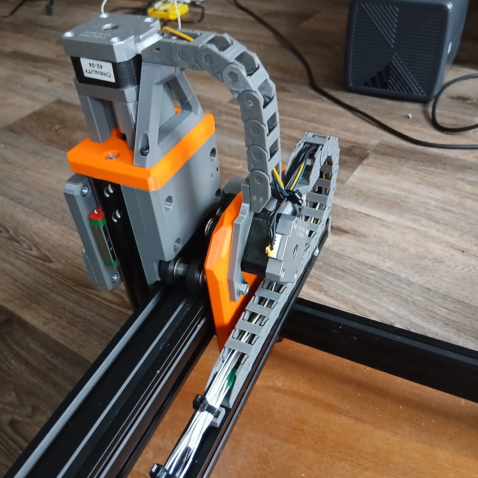 Mô hình này là một hệ thống quản lý cáp dạng mô-đun cho máy E3CNC, được thiết kế để sắp xếp và cố định đường đi của dây cáp dọc theo khung máy.