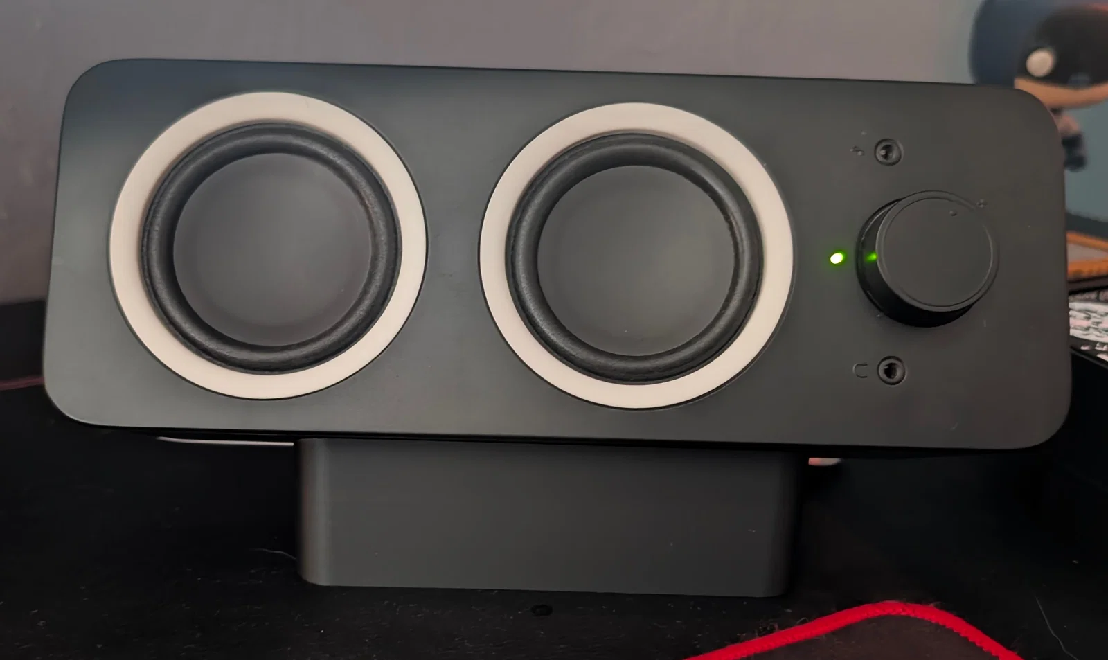 Mình đã thiết kế một chiếc chân đế giúp đặt loa Logitech Z200 nằm ngang, rất tiện để bố trí dưới màn hình máy tính. Phần chân đế này được thiết kế để tạo góc nghiêng, hướng củ loa thẳng về phía người dùng. Độ cao của chân đế được tính toán vừa đủ để phần chân phía sau của loa chỉ vừa chạm nhẹ vào mặt bàn. Các bạn cũng có thể thử dùng cho những dòng loa máy tính khác bằng cách thay đổi kích thước (scale) cho phù hợp.