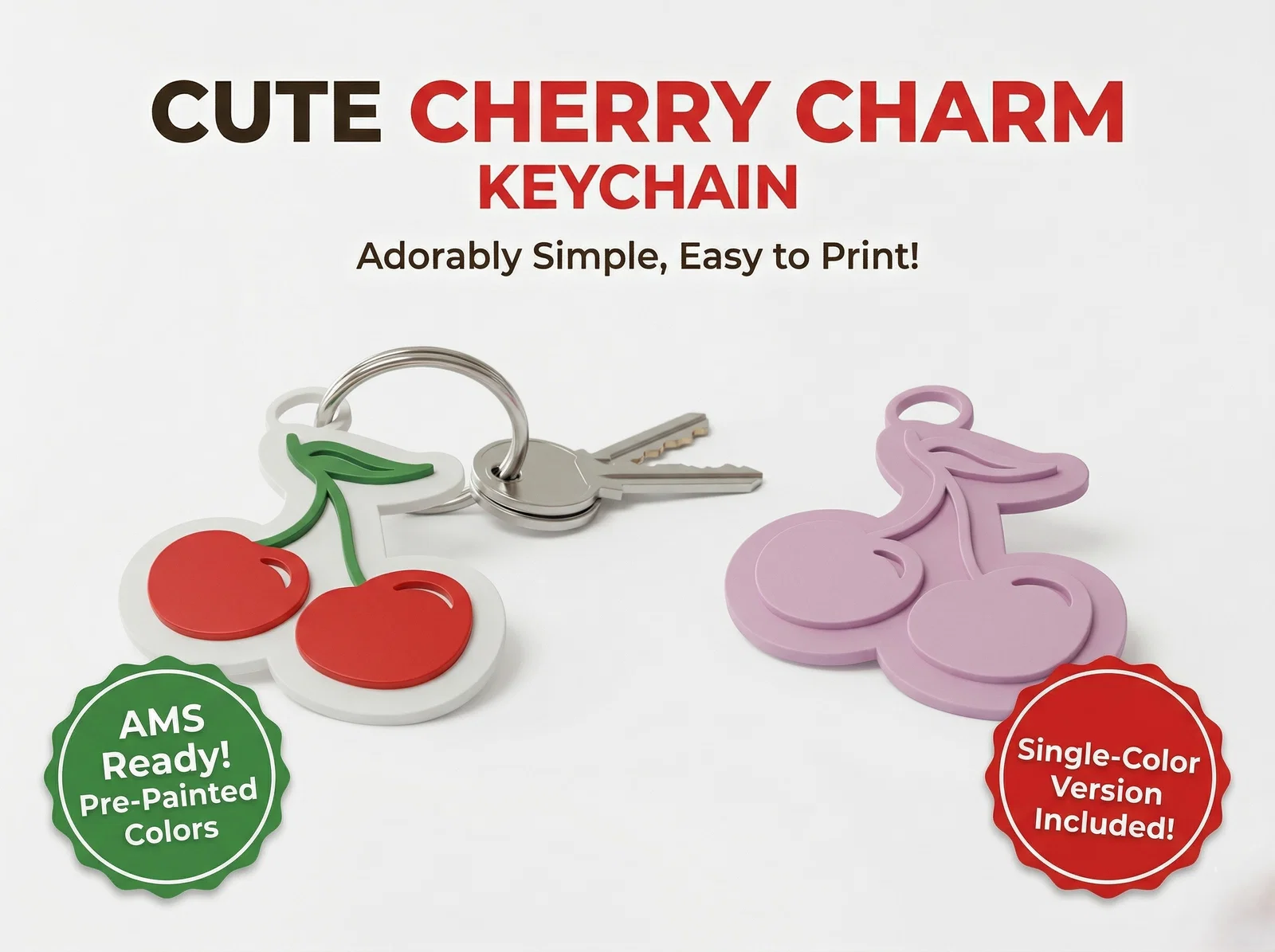 Mẫu móc khóa hình quả cherry cực dễ thương, thiết kế chuyên biệt cho công nghệ in nhiều màu AMS. Sản phẩm có các phần riêng biệt cho quả, cuống và lá, không cần dùng support, cực kỳ nhanh chóng và dễ in cho mọi người.