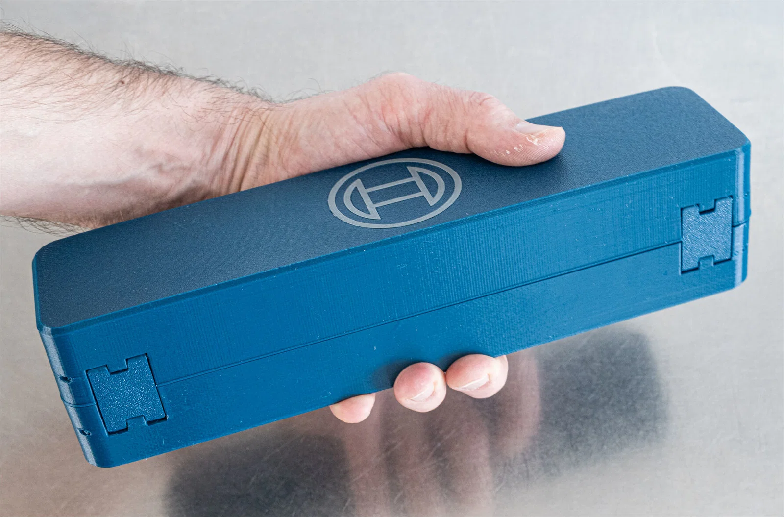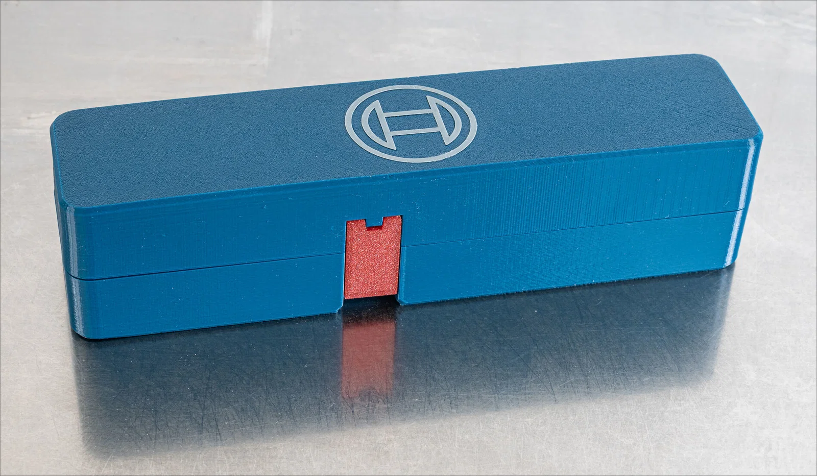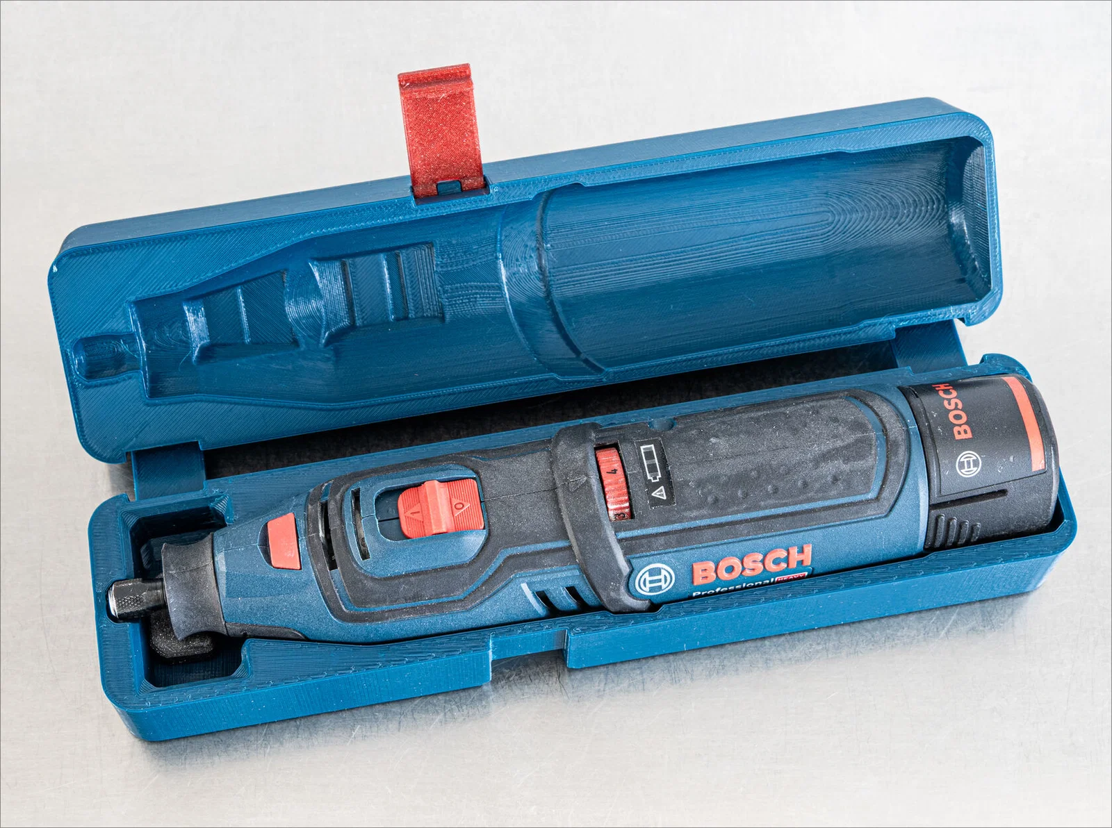Thiết kế hộp có bản lề và khóa ẩn giúp bạn cất giữ máy gọn gàng. Không cần dùng thêm ốc vít hay đai ốc nào cả, chỉ cần dùng vài đoạn sợi nhựa (filament) là được. Hộp còn có ngăn để cất cờ-lê tháo đầu kẹp (collet wrench). Bạn cũng có thể in thêm logo Bosch để gắn vào hoặc dùng hộp trơn cũng không vấn đề gì.