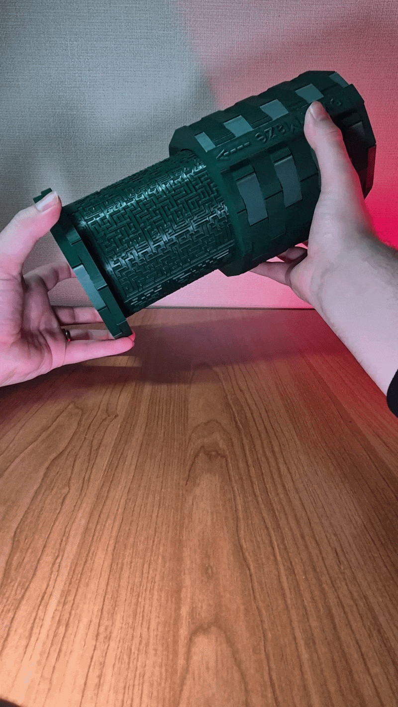 Hình dáng hình trụ táo bạo, bao bọc bởi các đường mê cung chi tiết, tạo nên một vẻ ngoài ấn tượng như một tòa tháp giải đố thu nhỏ. Khi cầm trên tay, bạn sẽ cảm nhận được độ chắc chắn, khơi gợi sự tò mò và ẩn chứa thử thách ngay bên dưới bề mặt. Đây không chỉ là một món đồ chơi, mà còn là một tác phẩm trưng bày đầy phong cách cho bất kỳ ai yêu thích giải đố cơ học và tương tác trực tiếp.