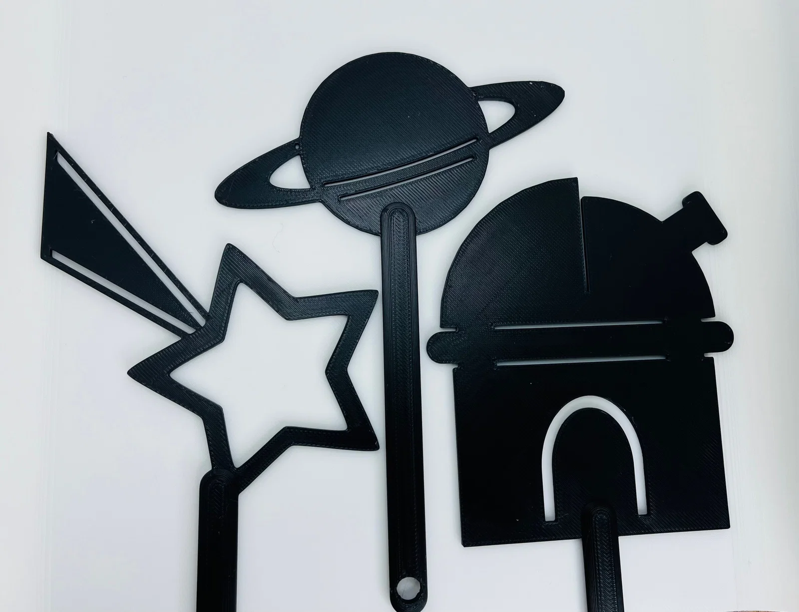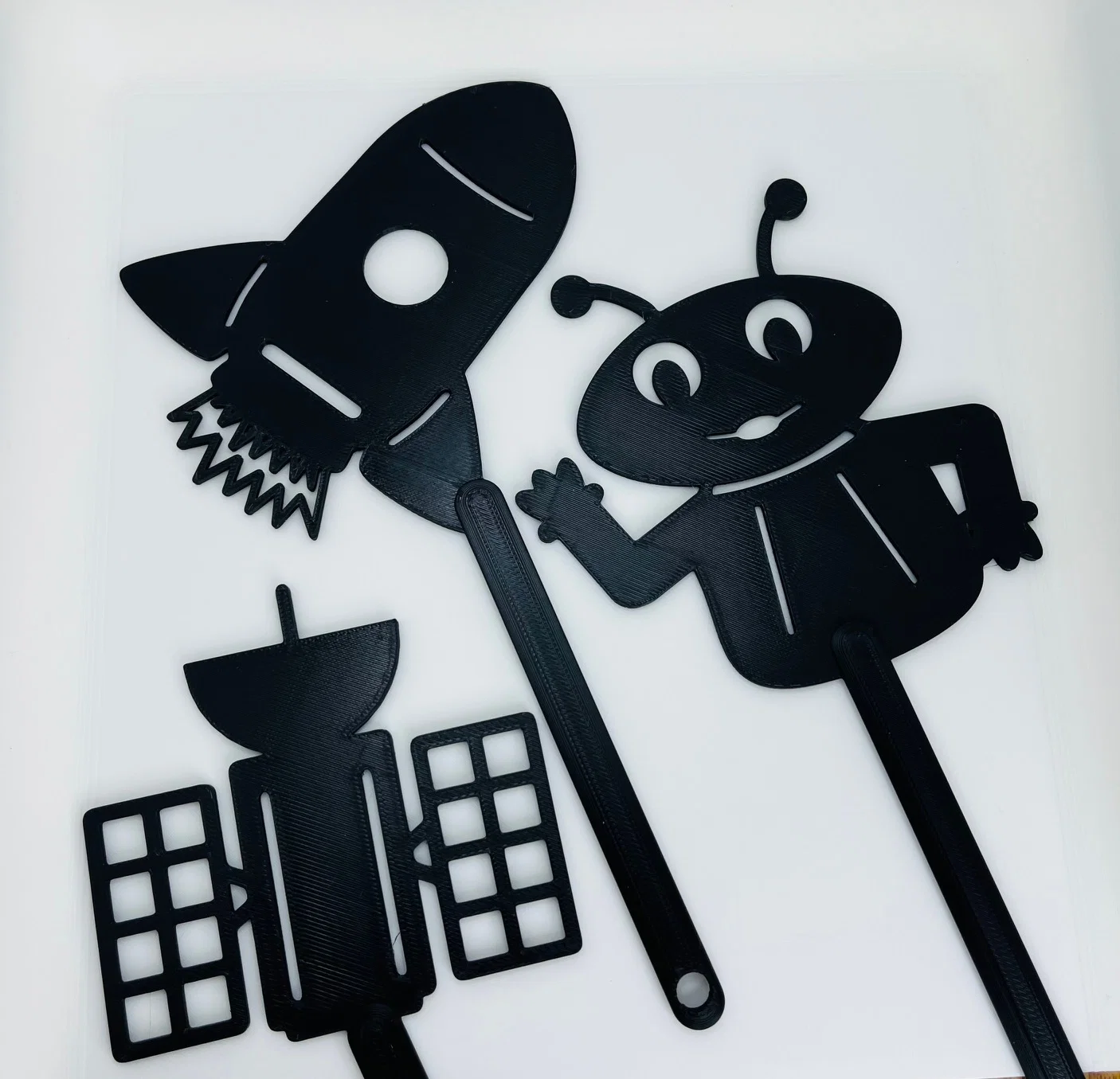 Bộ sưu tập gồm sáu mô hình chủ đề không gian dùng để làm rối bóng kể chuyện cho bé.